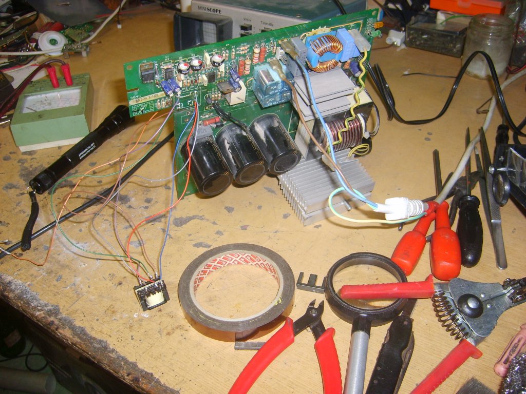 Ahogy ígértem, csináltam egy meghajtó trafót a Merkle hegesztőbe. Csak ideiglenesen kötöztem be, próba képen. Először meglepett a jel alakja, de rájöttem, hogy légrés van a vasmagban és torzítja a jel alakját.