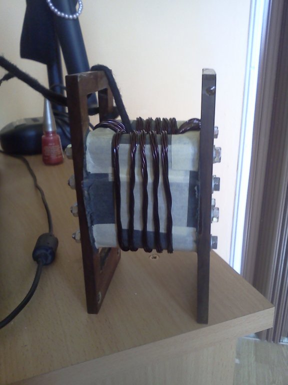 Nos így nézne ki a primérem a magon 5 szál 0.9-es cuz-al.Ha azt mondjátok jó lesz akkor megúsztatom lakkban és kap mégegy szigetelő papírt.Utána mégegy sor lakk és úgy a bandázsszalagos szekundert.Ezzel a sodrattal szerintem szebb lett a tekercselésem is.A menetek sehol nem érnek össze egyáltalán és a mag közepén is nagyobb a hely.