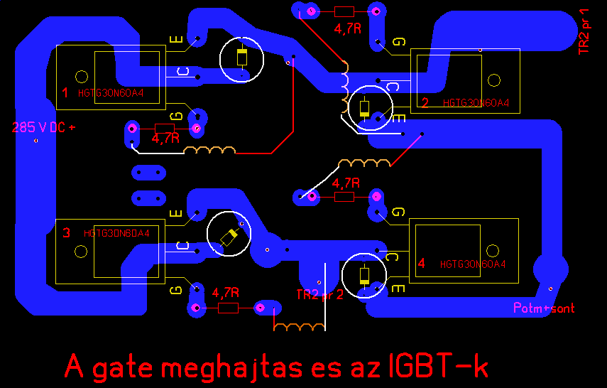Amíg a gate trafó 4db szekunder tekercsei nem így -tehát pl piros kezdet, fehér vég- és a bekarikázott Schottkyk nem lesznek megfordítva, addig nem is fog megfelelően működni.