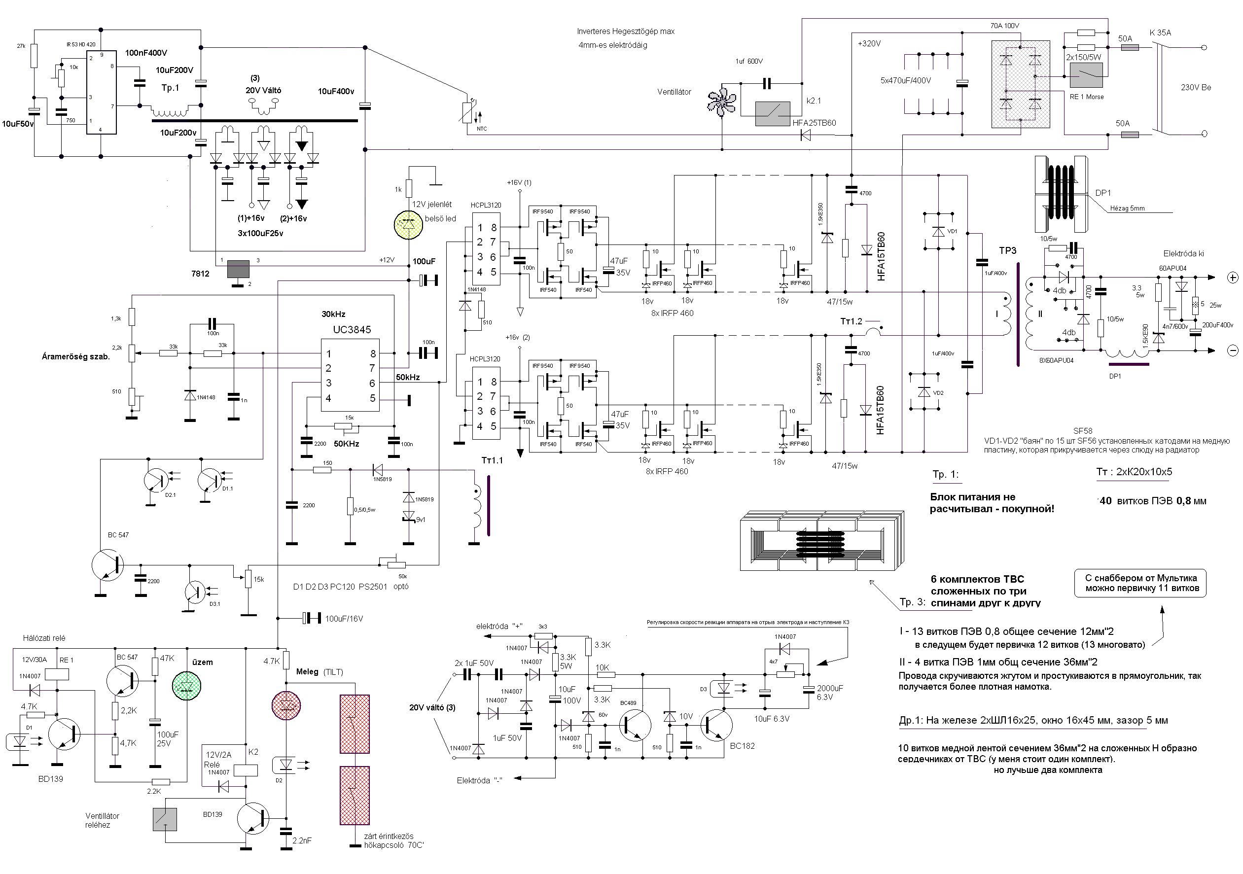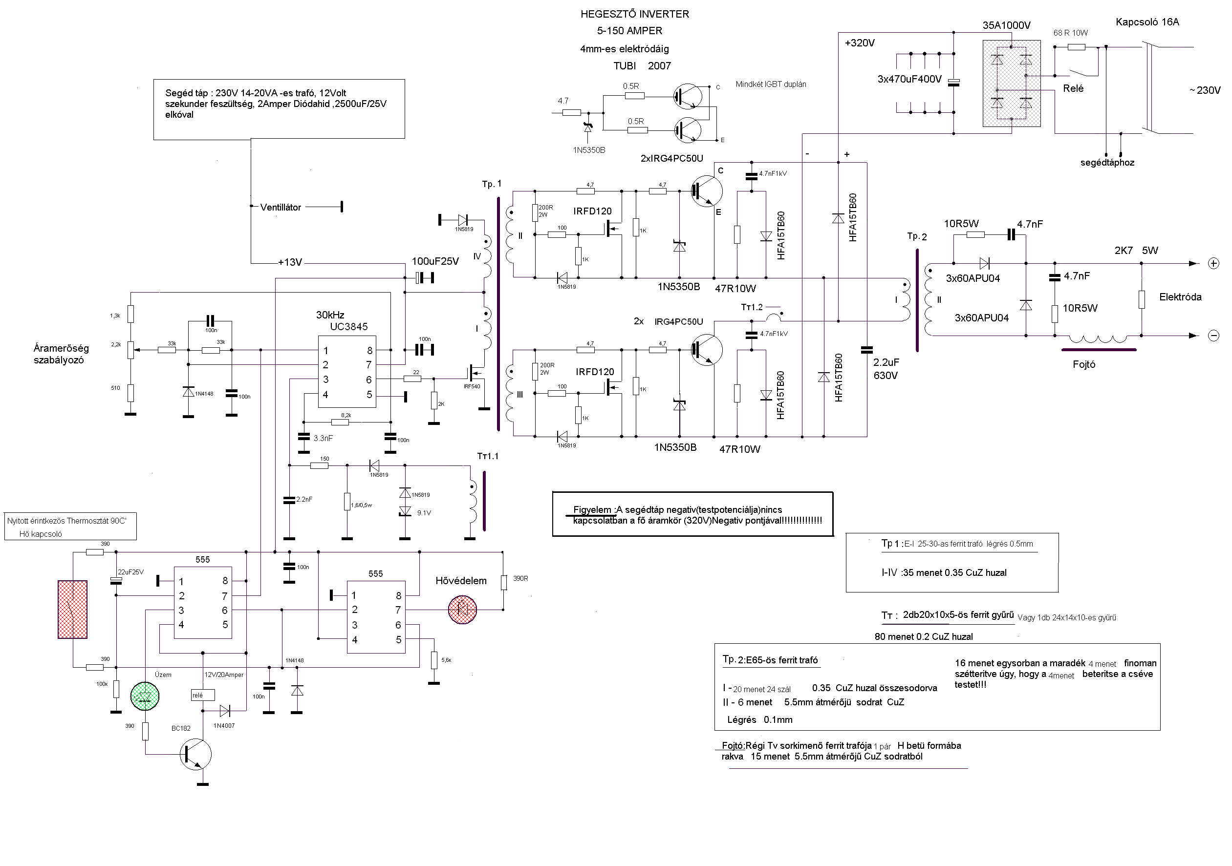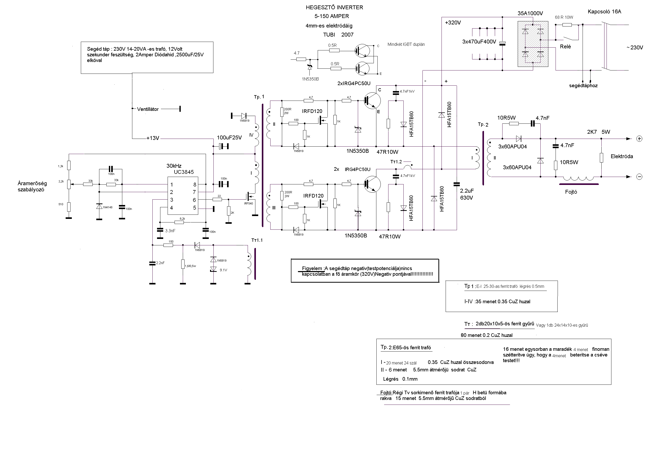 A 4-500mA igaz is,mint segédtáp áramfelvétel,ha a vezérlésben bent van minden mint a rajzon,ebben bent van a ventilátor árama is a ledekkel,relével és az egész áramkörrel együtt kb. 12,5V segédtáp fesznél.Ha a segédtáp 12V -ről megy az áramfelvétel jelentősen csökken,mintegy 1/3 résszel és a 200 ohm ellenállások is csak langyosak és nem fűtenek.A mostani vezérlésem,ami ugyan az mint a régiek,ventilátor nélkül 230mA áramot vesz fel,relével védelmekkel együtt.A kimeneti egyenfeszültséged alacsony.Szóltam,hogy a trafó menetszáma nem stimmel,egy előző levelemben,itt 1 menet is sokat számít.A 21/6 menet helyett a 21/7 menettel kellene,hogy adja a 45V feszt,de nem fogja adni,mert a gerjesztés is más mint eredetileg.Mi 20/6 menettel csináltuk a 19/6 menet helyett és jelentősen csökkent a kimeneti fesz,de még jónak mondható értéken van.A főtrafóban sok mindent változtattál,menetszám,primer vez. keresztmetszet,ezek mind okozhatják azt amit mértél.Biztos,hogy eljut a szabályzó jel a potiról az UC 1 lábára?Itt a poti állásától függően pozitív feszt kéne mérni.Néztem az IGBT-id adatlapját,most lehet ,hogy tévedek,nem igazán vagyok otthon az értelmezésben,de nem sok nekik a 37-38kHz (?),ott mintha csak 20 kHz lenne említve,ha tévedtem akkor bocsánat!
