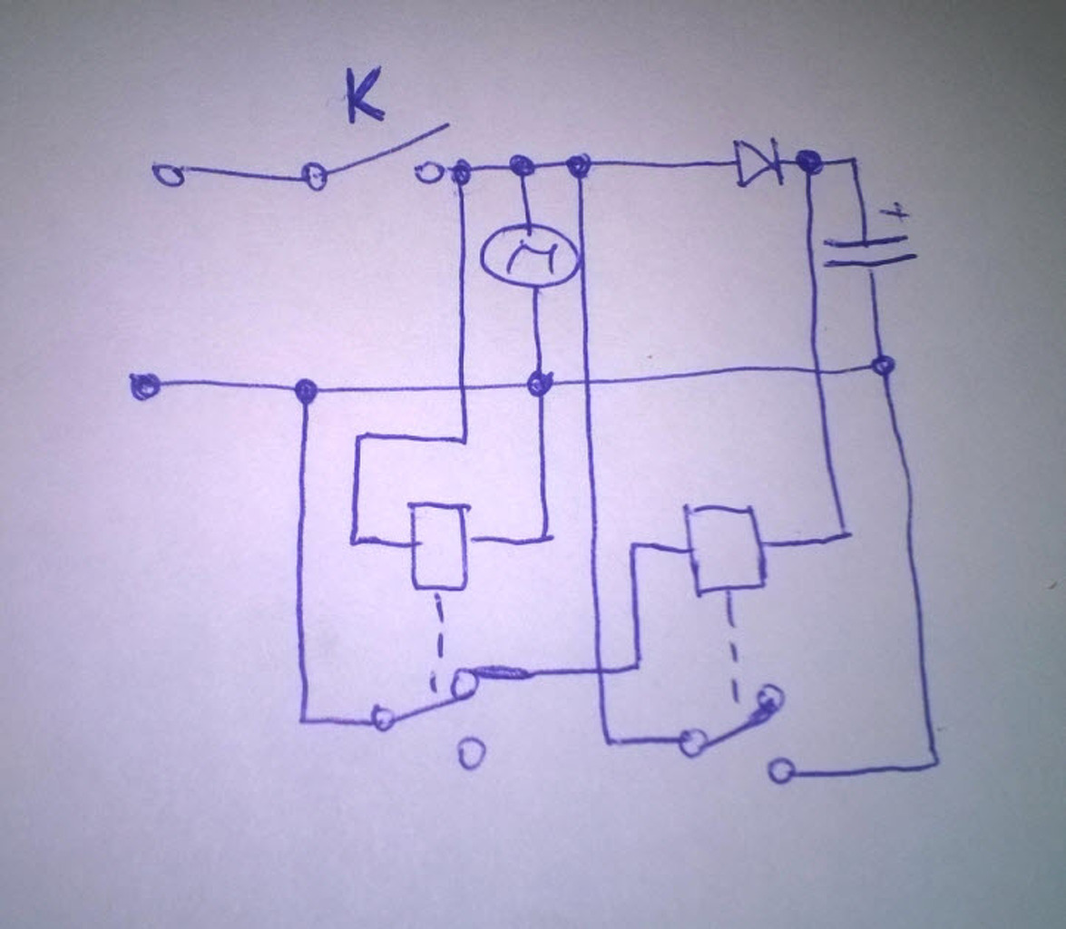 Igazából nem 1 relé az hanem 2 és még egy dióda meg 1 kondi. A kondi mérete határozza meg mennyi ideig marad behúzva a 2. relé. Csak egy pillanatra zárom össze de az pont elég arra, hogy a motor lelassuljon, a maradék lendülete a forgórésznek még max 1-2mm tol előre rajta. Az meg belefér. Az ellenállással az a baj hogy nem lassítja le elég gyorsan a motort. Keletkezik valamennyi hő de nem valami sok. Most hamar kézzel megrajzoltam mit is tettem bele valójában.