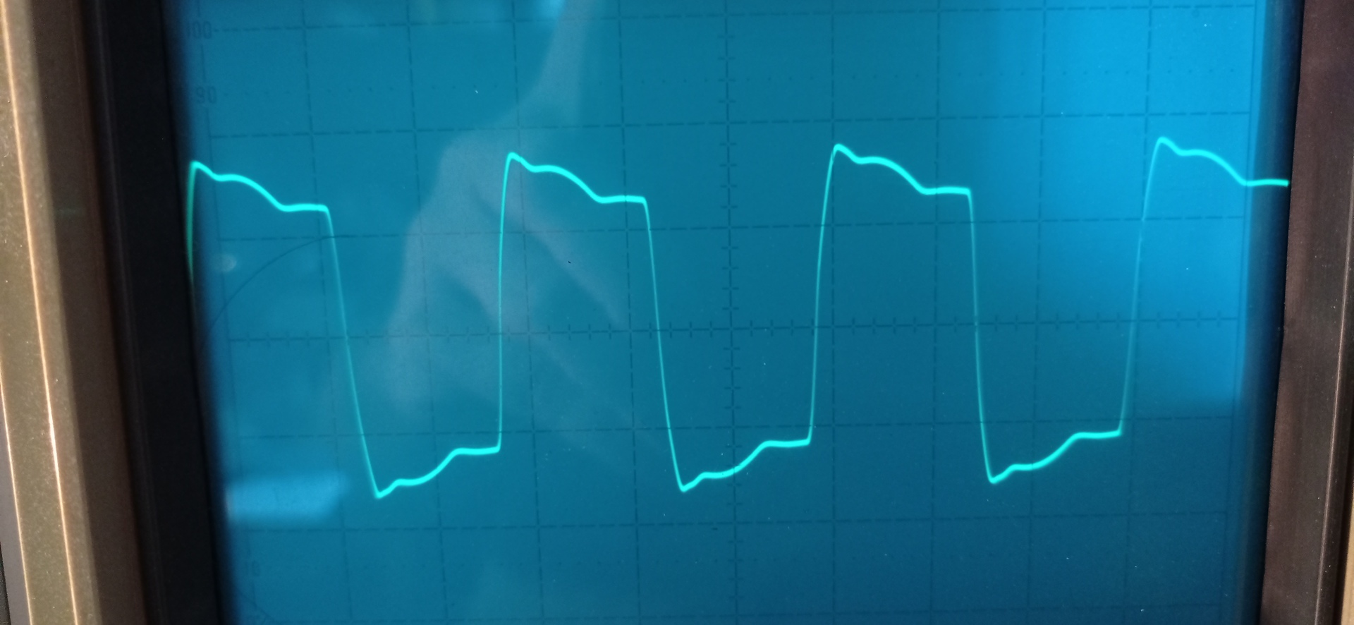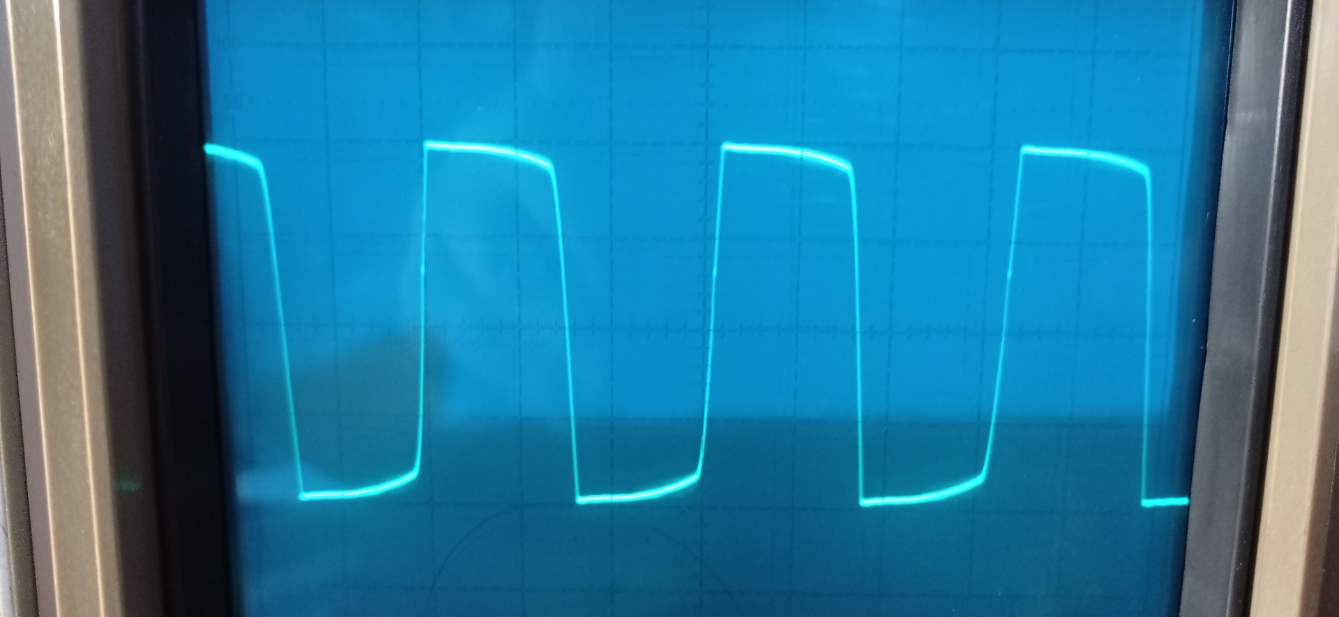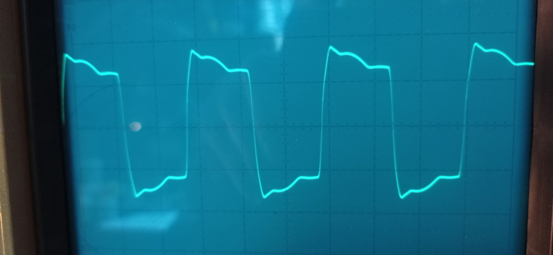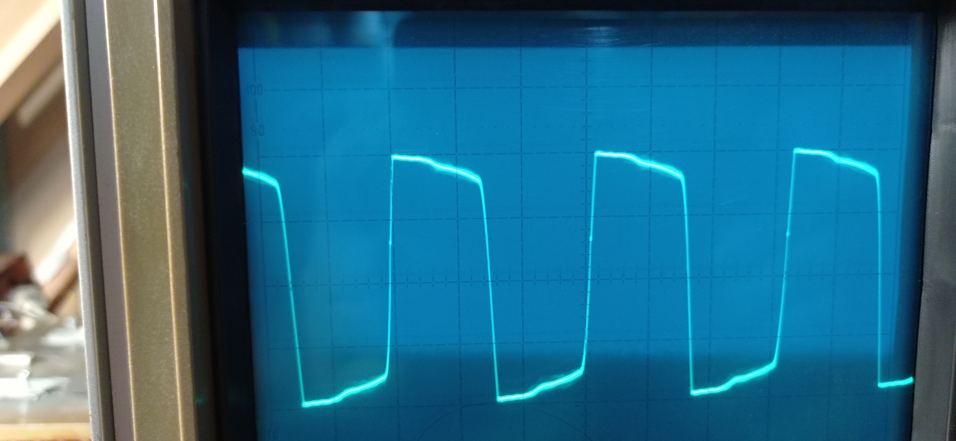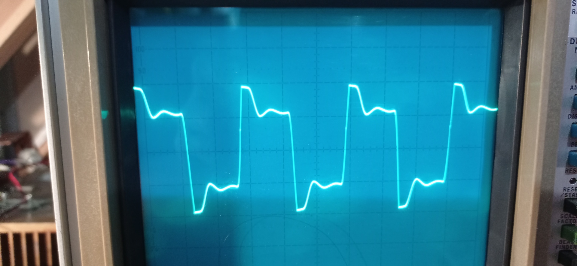 Szerintem kalibráld be a mérővezetéket a szkóp saját négyszög kimenetével,mert ez a fel-lefutás gyanúsan hosszú. A saját négyszögjel a szkópon biztosan négyszög, a mérővezetékedet ráteszed a szkópod négyszög kimenetére, ha ott tökéletes négyszöget látsz akkor a szkóp jó,de a meghajtó áramkörrel valami nem OK.