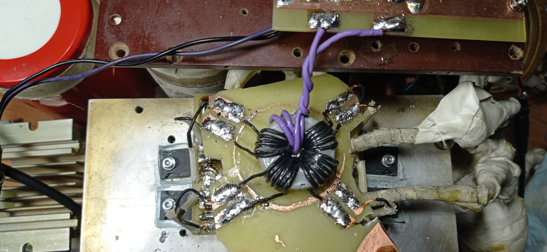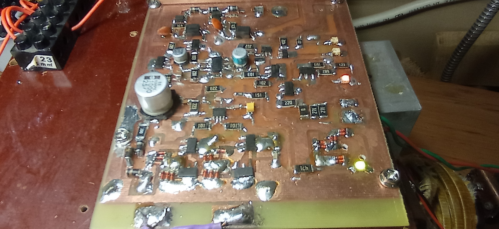 A BCP53-nak az BCP56-os a párja és ezek bármelyikének elég széles határok közötti az áramerősítési tényezője... A tranzisztorokon(a 2 darabon) eső feszültség nekem soknak tűnik(3,5V). A nyomtatott áramkört jó volna lemosni valamilyen zsíroldóval pl. izopropil alkohol. 15V 1,5A-os kapcsolóüzemű tápegységet használt bistvan196700. Egy próbát megérne a tápegységed után még egy fóliakondenzátort tenni (közel a BCP-ékhez) mikrófarados tartományban pl.1-2uF.