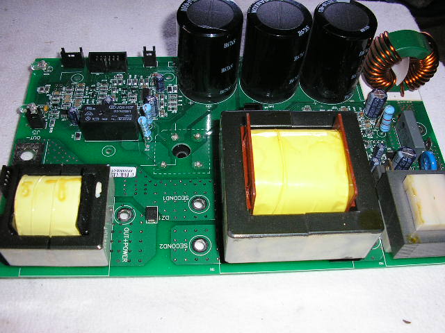 Egy újabb ok a túlfesz. védelem megalkotására.Hoztak egy kis masinát,nézzük meg mi a baja.Agregátról használták többször is gond nélkül,de egyszer gondoltak egyet és az agregát másik 230V csatlakozójába bedugtak egy 2kW flekszet és elindították,persze a hegesztő is be volt kapcsolva,csak épp nem használták.Csak akkor vették észre,hogy baj van,mikor újra hegeszteni szerettek volna.A gépen elszállt (1 biztosan) a jobboldali 470µF kondi (kicsit látszik milyen púpos az írásnál),a jobboldali IGBT sor a 20 db. SMD ellenállás a 4 kisebb tokozású dióda,a hálózati egyenirányító,a meghajtórész (L6385) is halottnak látszik,a segédtáppal együtt,semmit nem csinál a gép.