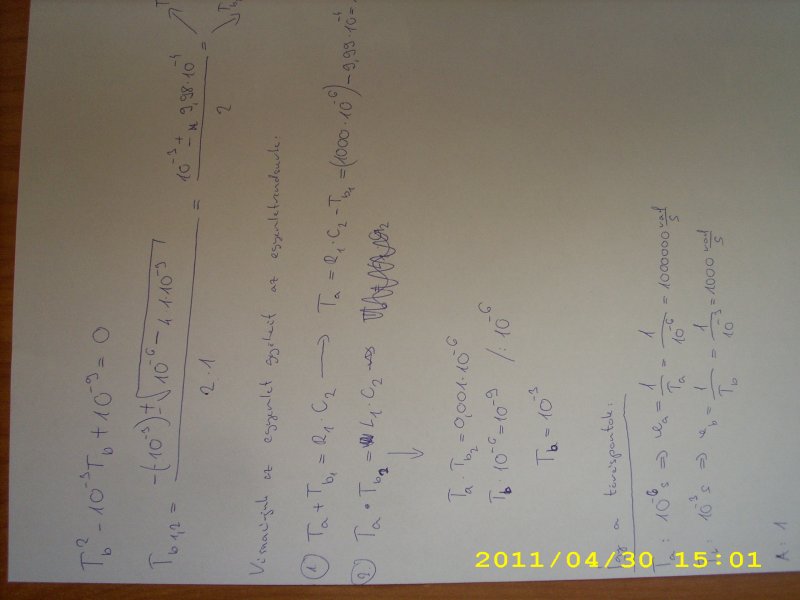 A másodfokú egyenlet egyik tagja tb2= 10^-6 és tb1=10^-4.Na eddig ok. Sikerült nekem is kiszámolni (végre). Na de, tovább visszaírom a 2. egyenletebe a 10^-6 ott jó ,mindkét oldalt kijön a 10^-9.De az elsőbe nem akar.Tudom nem szabályzástechnikai hiba ,én hibám de akkor se jön ki.