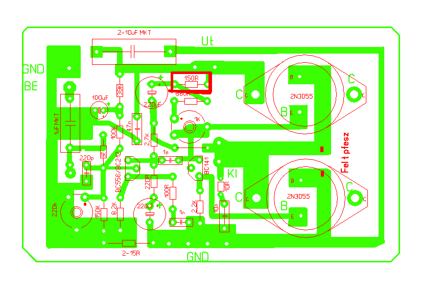 Ha valóban ez a te általad megépített nyák beültetése, akkor azt ugye tudod, hogy mindkét 2N3055-nél felcserélted a bázist és az emittert. A nyákrajz rossz!
