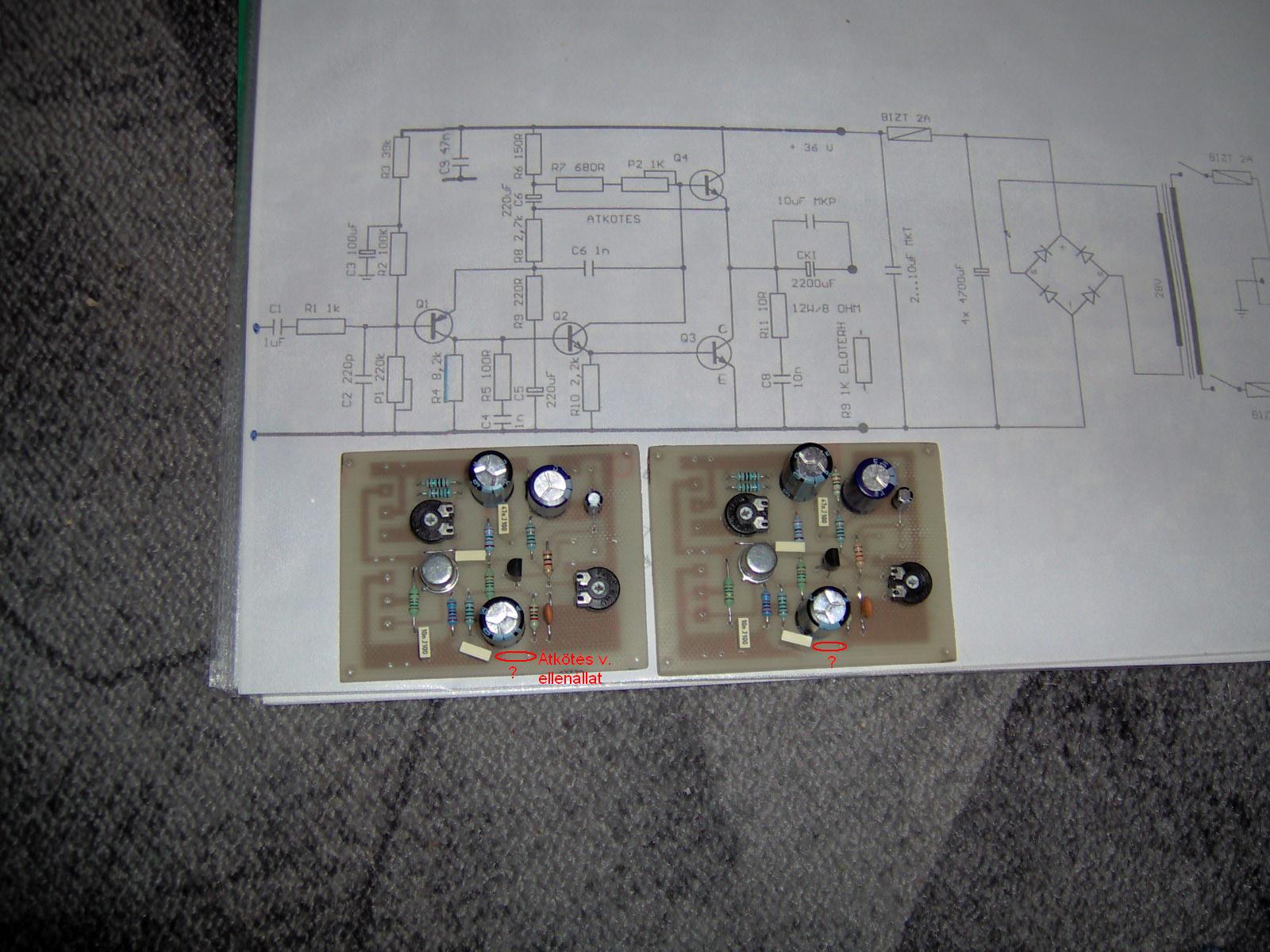 Én papírkartonra készítettem el a próbaverziómat nem néztem semmi mást, csak a kapcsolási rajzot és gyakorlatilag szinte ugyan olyan elrendezésbe tettem fel az alkatrészeket, ahogyan a papíron volt a rajz elrendezve. így tuti nehezebben lehet elhibázni. a próbaverzión, pedig nem kell elsőre megvastagítani a vezetékeket, nekem is csak vékony vezetékkel volt összekötve minden, aztán miután működött, megvastagítottam, ott ahol szükséges volt.