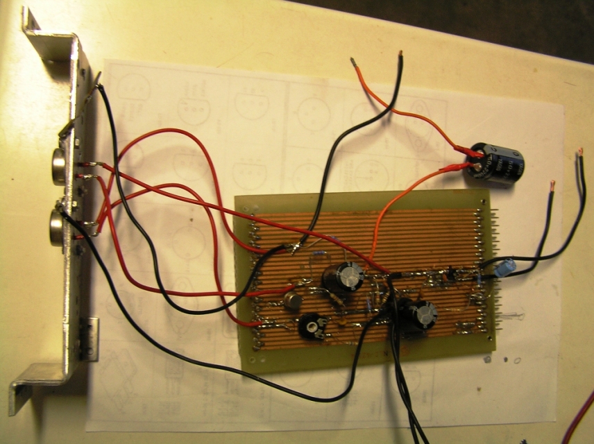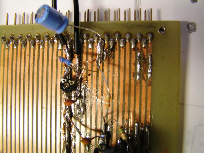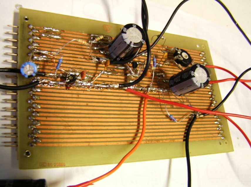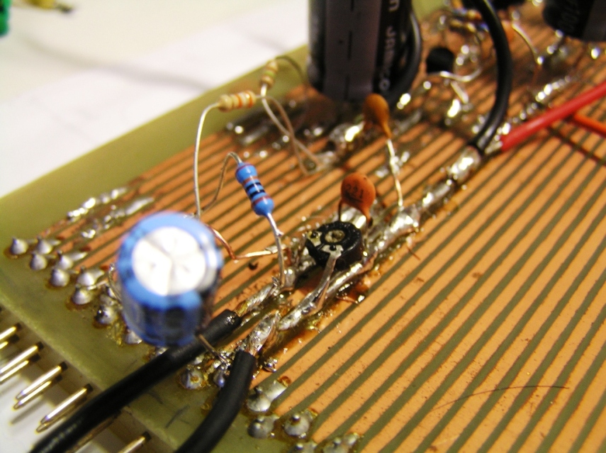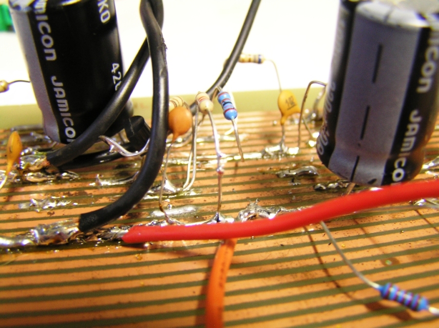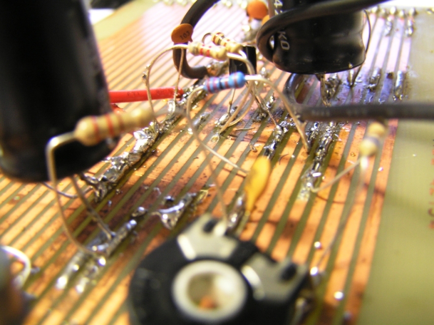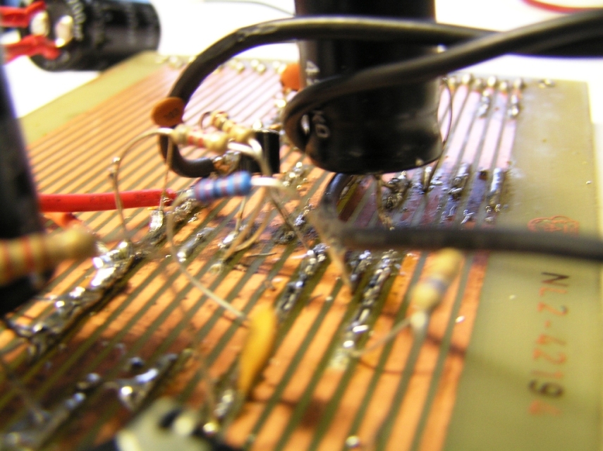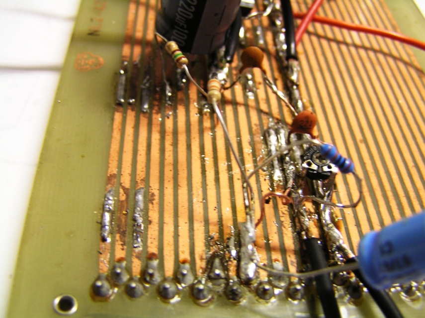 Huha ... hat ez a probanyák eleg veszelyesnek tunik. Eleg kozel vannak egymashoz a vezetosavok, konnyen elteveszthetoek es sajnos konnyen ossze is forraszthatoak veletlenul ha kicsit nagyobb on-pacni kerul oda ahova nem kéne. Nincs veletlenul egy raszteres probanyákod amin csak forrcsucsok vannak? Arra lehetne szellosen forrasztani az alkatreszeket is alul vezetekekkel osszekotozgetni ami kell. Vagy ha nincs ilyen nyákod, akkor légszerelve. Szerencsére egyszerű a kapcsolás igy siman megoldhato. Csatoltam 1 kepet ami az en erositomrol keszult amikor meg csak kiserleteztem vele (légszerelve). Egyebkent tokeletesen mukodott igy is. Probalkozz valami ilyesmi formaban osszeszerelni igy talan jobban atlathato lesz az egesz ha jo a térlatasod