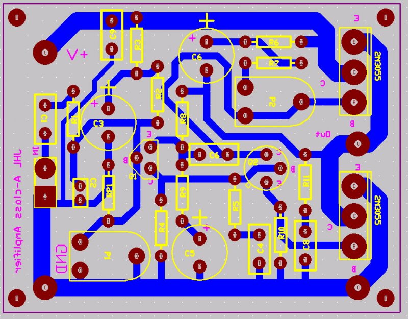 Összeraktam én is egy JHL-t, BC212,BC141 és 2N3055-tel. A régi 69-es kapcsolást az Ágoston könyvből. A tápfeszültségem 36V, a kimeneti áramot tudom állítani. A féltáppal van problémám, hogy kb. beáll 10,5V-ra és a potit tekergetve - a közepénél minimálisan, egyik végállás közelébe az egyik tranzisztorra ráküldi a 36V-ot, a másik végállásba pár voltot mozdít. Már mindent megnéztem, de csatolom a nyáktervem, hátha ti találtok hibát... Ha nincs hiba, beküldöm a rendes nyákterveket, ezzel is gazdagítva a felhozatalt... Segítségeteket előre is köszönöm...