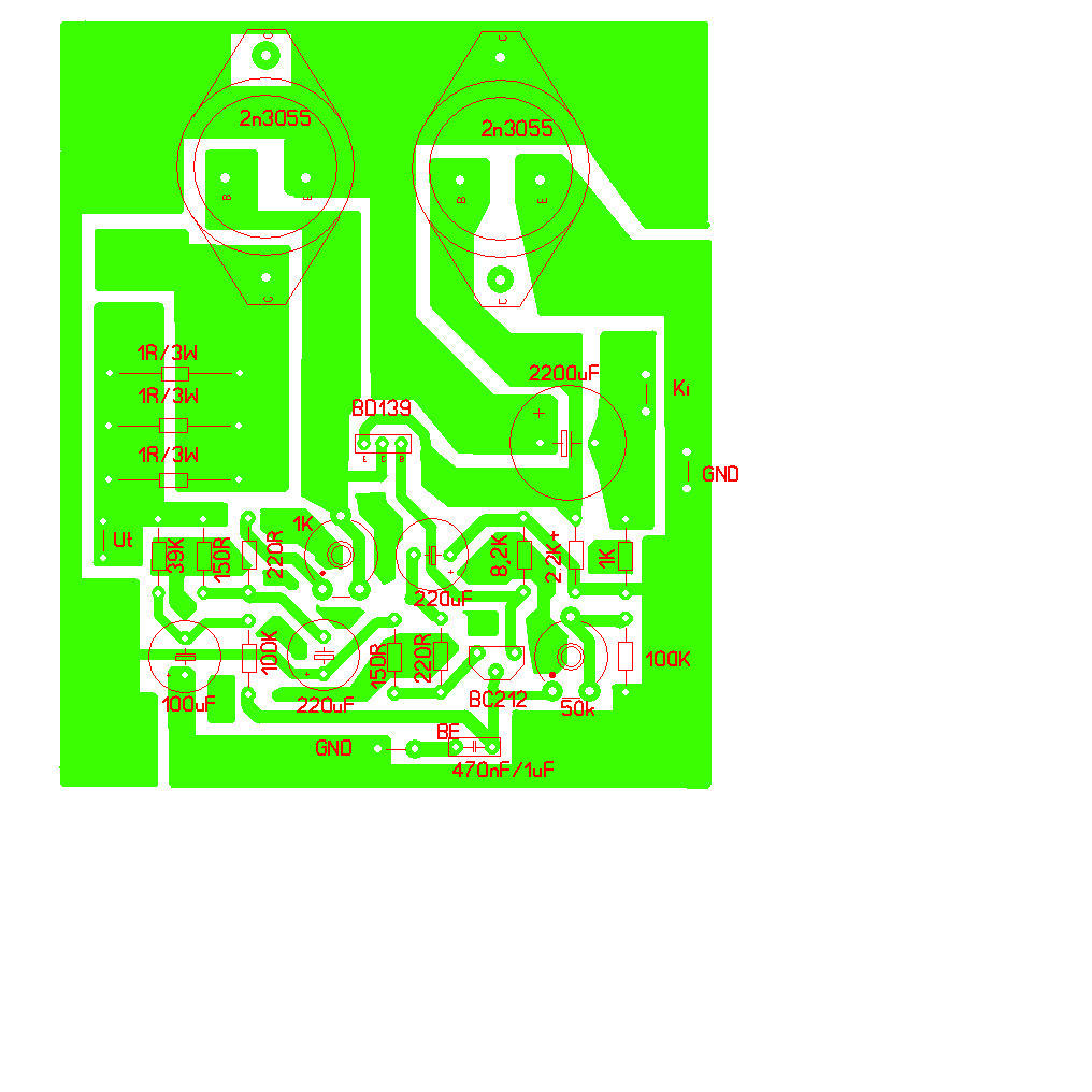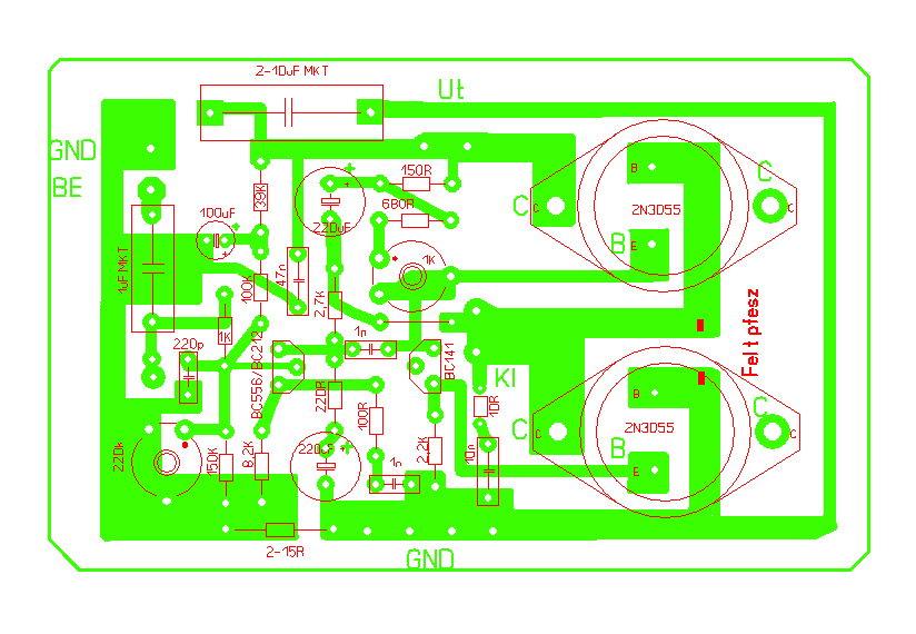 Nem kellett volna uj nyákot tervezned ide is fel van téve egy nyák és mindjárt felteszek mégegyet. Én kétféle kapcsolást építettem meg az elsö ami az Ágoston könyvi kellemesebb hangzást adott de a másik sem rosz. Van egy nyákkészítés topic, nézz el oda mert ez a nyákgyártás módszer nem a legkönnyebb Próbáld ki a Sprint Layout progit. Meglepöen egyszerü. Az ónózásal nem kell spórolni de én inkább azt ajálanám neked hogy inkább ugy növeld a keresztmetszetet hogy valami vastagabb 1-1,5mm-es rézvezetéket forrasz a nyákra. Ezeket a meghajtó tranyókat és a végtranyát honna vetted? Melyik kapcsolásból? Azt tudnod kell hogy nem véletlen vanak a 2n3055-ök. A tervezö ezzekhez lötte be a kompnezálást. Teljesn felesleges a gyors tranyó. Ha változtatni akarsz MJ15003-at használj. Az a tervezö terveiben is szerepel. A TO-3-as tokok jobban türik az ilyen nagy folyamatos áramokat. Ezekel a tranyókkal én is kiváncsi lennék a hangjára . Érdemes követni a legutolsó 2000-res kapcsirajzot. Ez véleményem szerint már nem JLH-lesz... Na most azt a badarságot honnan vetted hogy kicsi trafó nagy kondi = lágy hangzás... nem tudom. Mivan ha nagy trafó nagy kondid van?? De elösször is számolgatni kellene egy kicsit. 1.5A*35V=52Watt+ 15Watt hasznos teljesítmény az már majdnem 70Watt. Ekkora trafóval még egy oldalt sem tudsz kihajtani. Nem beszélve arrol hogy semmi teljesítmény tartalékod sem lesz. Minimum 120Watt kéne oldalanként. Sztereóba 250-300Watt. A gyors diódát ki kell próbálni de nem feltétlen hoz javulást.. Én inkább egy 25A-es fémházas Graetz kockát ajánlok. A teszten nekem 15Amperessel ment és eléggé forrósodott. Én vettem hozzá 35A-eset. A táp kondiból sosem elég, Föleg egy A-osztályúnál. Én 20eµF-ot egy oldalra tennék. És a két oldalnak külön tápot adnék helyedben. És remélem olvasgattad ezt az oldalt: JLH2000 Ágoston könyvéböl: Innen Egy módosítása Darazsx: Milyen Tranyókat használtál? rendesen el voltak szigetelve, mert elsönek én is igy vágtam ki 4-et Van aki szerint pont az ellenállás miatt gejed, nekem be van rakva. Semmi baj vele. Felteszem azokat a nyákokat amiket én megcsináltam. Az elsö az ágostonkönyvi nekem valahogy jobban tetszet még próbán... de a trimmerek értéke más kell legyen mert magassab tápfeszenél nem lehet beállítani velük... A fileok Sprint Layoutban készültek.