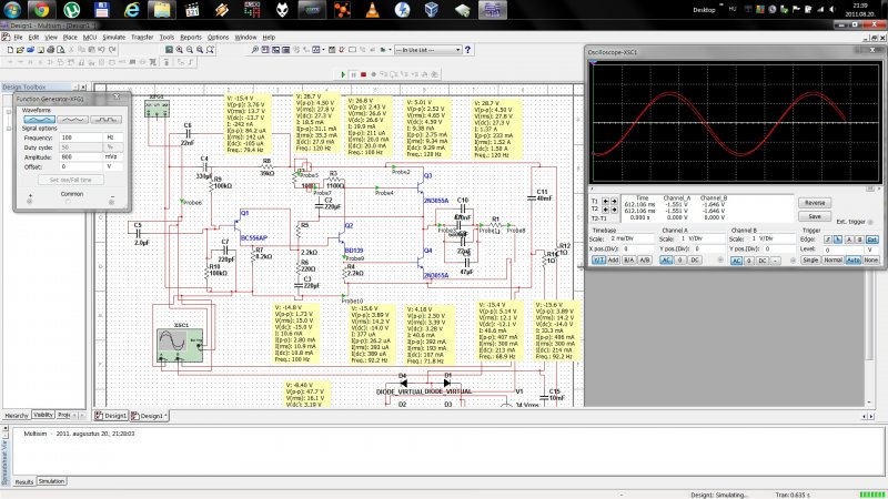 Szóval gondoltam egyet és a türhetően müködő kapcsolásomat teljesen átalakítottam a régi 69-es verzióvá jlh bácsi ajánlásával 33.4v mellé gondoltam berakok 800 ohm + 100ohmot hogy beállítsa a nyugalmit (a 100 ohmosat párhuzamos 2db 200-as és a 800-as párhuzamos 4db 3300-as) gondoltam így jó lesz na a teszt alatt bd249-esek voltak bekötve bekapcsolásnál pár másodpercig 4-5 amper aztán felugrott és 20+ lett ergo megöltem a tranyókat. Gondoltam én vagyok hülye de amikor láttam hogy az ellenállások lenullázodtak meglepödtem... vagyis ha jól saccolok 1Wnál több esett rajtuk ... Felhuztam magam és multisimben lemodelleztem meglepetésemre 2A rms lett volna így a nyugalmi ami még nem is nagy baj de akkor miért nem volt elég az párhuzamos ellenállások? Végül 1200 ohm lenne célomhoz megfelelő a szimuláció szerint ekkor 1.2 A rms nyugalmi lenne ami már türhető 33.4V mellé és 8 ohmba (hangfal erősítő között 3db 2200 mikros low esr imp , 47 mikros bipolár , 2mikros mkp és 4,7 mikros tantál van). A 69-es kapcsolással futottatok össze hasonló hibával?