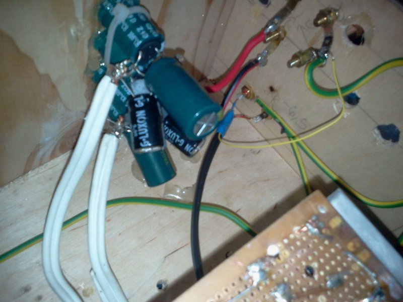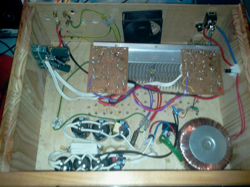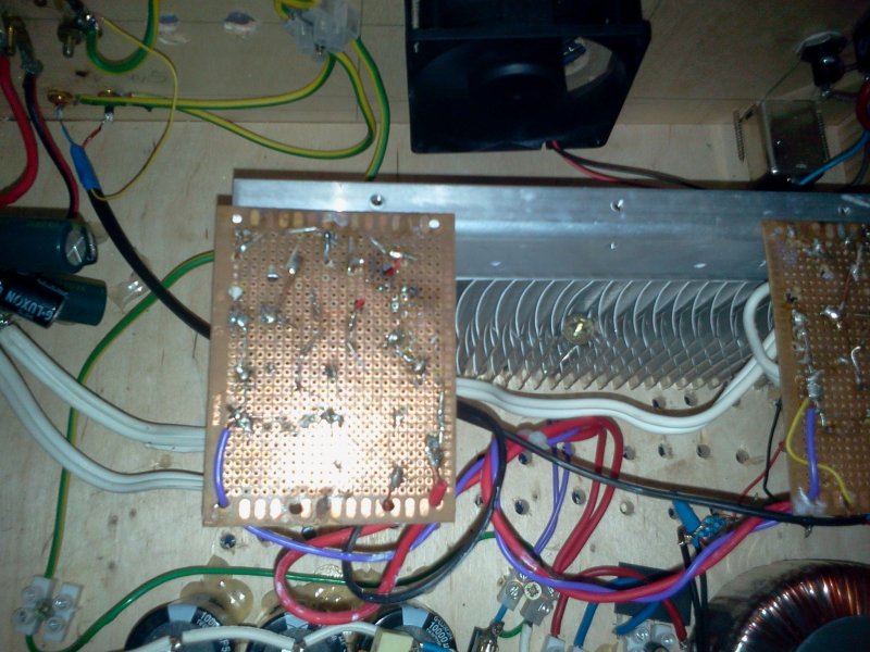 ![]() Már csak a külcsinen kell javítanom és elégedett leszek. BD249-esekkel lett végül megépítve amit lehet később cserélek 2sc5200ra (ami volt az elégett ). A hangzásától hanyatt vágom magam... Most már csak 320kb -es számokat tudom meghallgatni fáj a fülemnek a 128-as .Végül ami lett 69-es verzió. 33.4 v tápfesz terhelten 1.3 Amper nyugalmi (1.5 óra után erre ált be stabilan) Egy 250 wattos torroid 16 amperos graetz 40 000 mikro 63volt aztán 2*4 ohm 40 watt ellánállás aztán 30 000 mikro táp eleján végén mkp, kerámia, tantál kondik. Maga a kapcsolás bc556 bd139 bd249-el megvalósítva jó minőségű wima 2 mikros kondival az elején. Kicsatoló kondinak 3*2200mikro low esr imp + 4 mikro tantál 2 mikro mkp 47 mikro bipolár. Testnek beraktam a tápba egy 6.3amperos biztosítékot ami még nem sült ki De íme a képek.