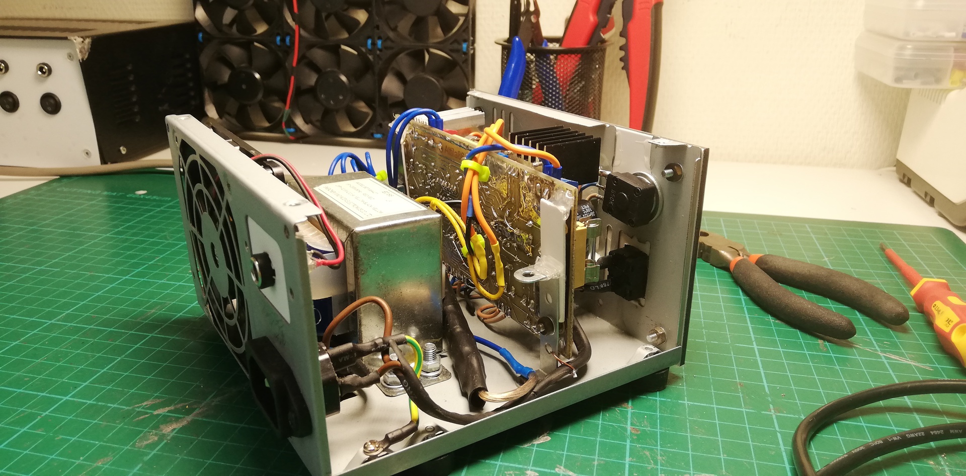 A vett pákának a hálózati kábele hibás volt, ezért cserélnem kellett. De csak három erű kábelem volt. Így azt raktam bele, így a sárga-zöld "csak lóg" benne. Gondoltam adok neki feladatot.