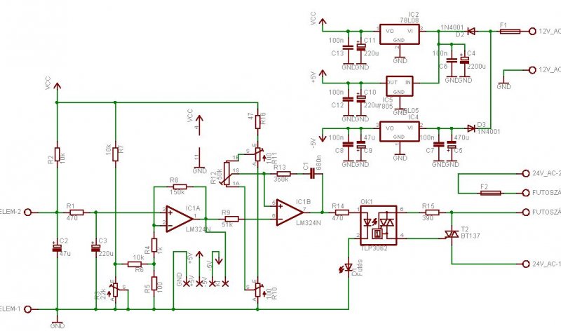Két mérést végeztem el: -Úgy hogy a rajzon bekarikázott pontot megfogtam csak így fűti a pákát: 5ÖS LÁB 2V os méréshatárba kaptam csak eredményt mindenhol,120 -140mV között ingadozott 6os-018V Elengedtem a két pontot így megállt a fűtés: 5ös-007-013V 6os-032V Testnek az LM324N 11es lábát használtam. Köszi a segítséget.