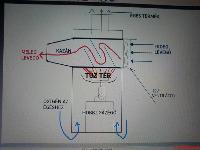 A rajzon lévő kazánt teljesen körül veszi a meleg levegő a tetejét nem szabad teljesen lezárni mert az égés termék visszaáramlása eloltaná a gáz égőt,a kazán lég csatornája teljesen el van választva az égőtértől oda semmiféle módon nem juthat be az égés termék!