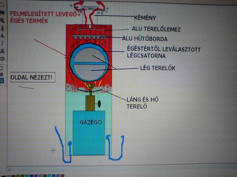Lehet picit félreérthető voltam, mert siettem. Én úgy gondoltam, hogy a mostani hőcserélő helyett lenne egy hűtőborda, aminek a bordázott felületét felülről lezárnád és a lezárt bordázott részen fújnád keresztül a levegőt, mert így nagyobb felületen tudna felmelegedni a levegő. És a borda külső felét pedig fűtené ugyanúgy a gázégő, mint most az eredetit. A borda mellett meg mint most távozna az égéstermék felfelé, ahol kivezeted.