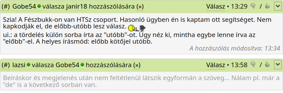 ![]() ui.: a tördelés külön sorba írta az "utóbb"-ot. Úgy néz ki, mintha egybe lenne írva az "előbb"-el. A helyes írásmód: előbb kötőjel utóbb. A hozzászólás módosítva: Kedd, 13:34