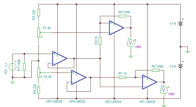 - Az érzékelőt a VS1 feszültségforrás modellezi, ami két egymással sorba, de egymással szembekapcsolt fényelemből állna. Így az erősítő bemenetére, a két fényelem által termelt feszültség különbsége kerülne.