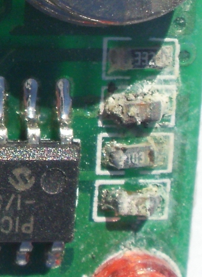 Ha esetleg nem lenne rajz.. A felső egy 3,3kohm-os ellenállás, a harmadik 10kohm-os. A másik kettőt meg kondinak nézem. Az IC 1-es lába tápfesz, ezért úgy gondolom az egy 100nF-os. A másikat nem látni jól, de előfordul hogy el lehet dönteni ha látni/tudni hogy a PIC melyik lábára megy. De a nagyfrekis fémkalapot is ki kell emelni, hogy megtisztíthasd alatta a fóliákat. Aztán próba cseresznye. üdv! proli007