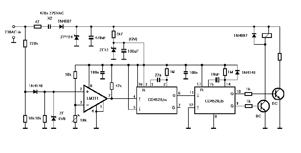 Végül az időzítések: az adatlap nem ad meg ekkorákat, de én már használtam ilyet 6-8 másodpercre is. A második - 20sec - szekciónál az elkó jó minőségű tantál legyen - mint általában a kondis időzítéseknél. Az 1M a felső határ - tapasztalat szerint - ettől lefelé állíthatod potiként, a kondit kísérletileg kell majd megállapítani, mert a szivárgás miatt úgysem lehet kiszámolni. A 27nF-ból ma már nem lehet igazán rosszat kapni. Itt az időzítésnek 20msec felett kell lennie 2-3msec-el, így egy periódson belül képes reagálni az áramkör.