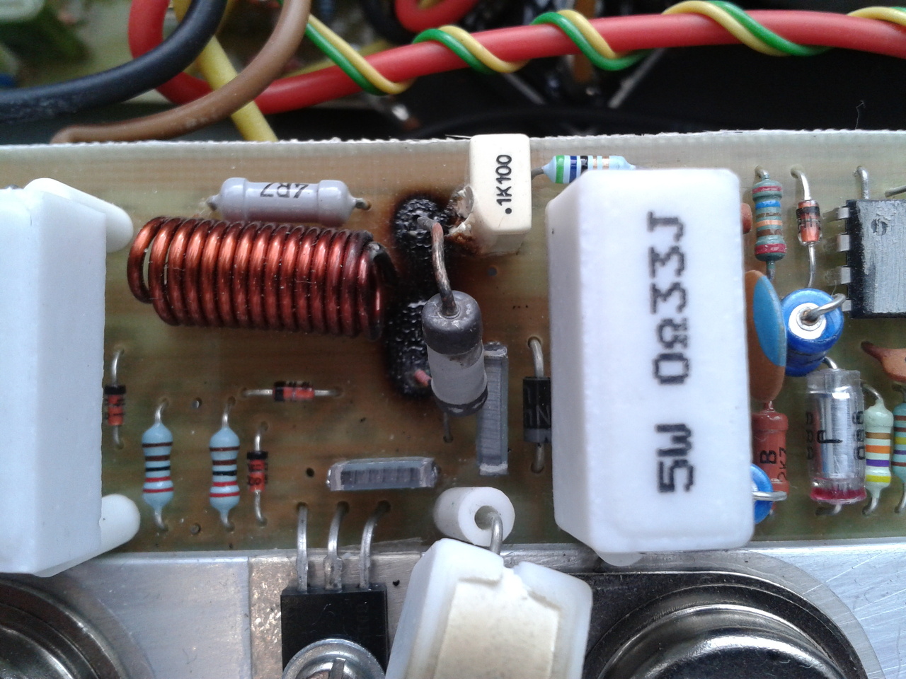 Szia! Itt a Castone témában találsz rajzot. Azt végtranzisztor emitter-ellenállásnak nézem. A tranzisztor párja valamiért nem működik, ide koncentrálódik a terhelés.