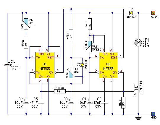 Lámpa villogtatásSziasztok!Egy lámpát villogtató kapcsolást szeretnék készíteni 12 V-os feszültségre. NE 555-ös, esetleg 556-os IC-vel. (Azért 555-össel, mert ez van itthon) Az alapkapcsolást ismerem, de úgy szeretném a villogtatást, hogy pár, 4-5 gyorsabb villogás után egy kis szünet legyen, majd ez ismétlődjön az áramkör kikapcsolásáig. A hosszabb és rövidebb impulzusok idejét állíthatóra szeretném. A terhelt kimenetre van megoldásom. Ha esetleg PCB is lenne hozzá, akkor teljesen boldoggá tennétek. Előre is kösz a segítséget.