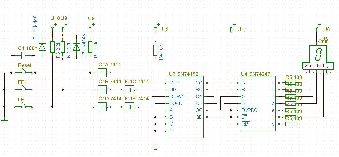 A reset gombbal párhuzamosan kötött kondi a bekapcsoláskori resetet végzi. A 7414-es IC egy 6 kaput tartalmazó smithtriger inverter ez végzi a prel mentesítést. A 4192 a számláló, a 74247-es pedig a kijelző meghajtó. Tápnak 5V-t kell neki, a kijelző közös anódos. A kapcsolást meg kell triplázni, kivéve az IC1A kaput és a hozzá való restet gombot, kondit és felhúzó ellenállást. A számlálók CLR bemeneteit közösíteni kell. Összesen 6db IC, PIC-el lehet egyszerűbb volna, de ahhoz sajnos nem értek . A kapcsolás TTL IC-kből épül fel, de biztos megoldható CMOS-al is.