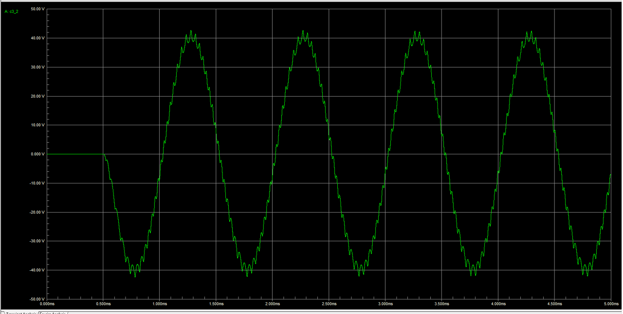 A szimuláció szerint +/- 55V-ról táplálva és 80Vpp-ig vezérelve a kapcsolójel nem esik 25kHz alá. 1 kHz-en a torzítás 100W-nál kisebb mint 1%. fele ekkora bemenő jelnél (25W) 0,1 alatt van a torzítás. 100W szinusznál a táp bemeneteken az együttes bemeneti teljesítmény 110W körüli, tehát 90% hatásfok körül járhat. Persze ilyen kommersz alkatrészekből nem lehet nagy kapcsolófrekin járatni, de szubra jó is lehet. A pozitív tápágban lévő 1milliOhm csak a mérés miatt van Gyakorlatban nem kell.