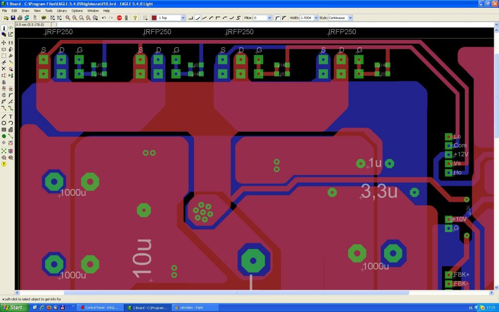A 7815 40V-os táppal és a 660R előtéttel nagyon a határon dolgozik. Maximum feszültsége 35v. Cseréld ki BD139+ zeneres áteresztőre. Ezek az IC-k nem szeretik a stab kockákat (tapasztaltam) Az élesztést úgy kellene hogy leveszed a VCS-t és a bemenetre 400kHz es jelet kapcsolsz amivel majd az IRS tud komparálni. A félhíd kimenetén megfigyelheted a négyszögfeszt, majd beállíthatod a szükséges DT-t. Milyen feteket használsz? A panelről lemaradtak a pufferkondik a fetek tövéből, a főliakondik is nagyon messze vannak. (remélem nem ez lesz a végleges nyákterv) Az IC elszálásának sok oka lehet. A leírásod legelején és a kevés VCC tápfeszre gondolok, ka 8V alá esik kikapcsol... üdv!