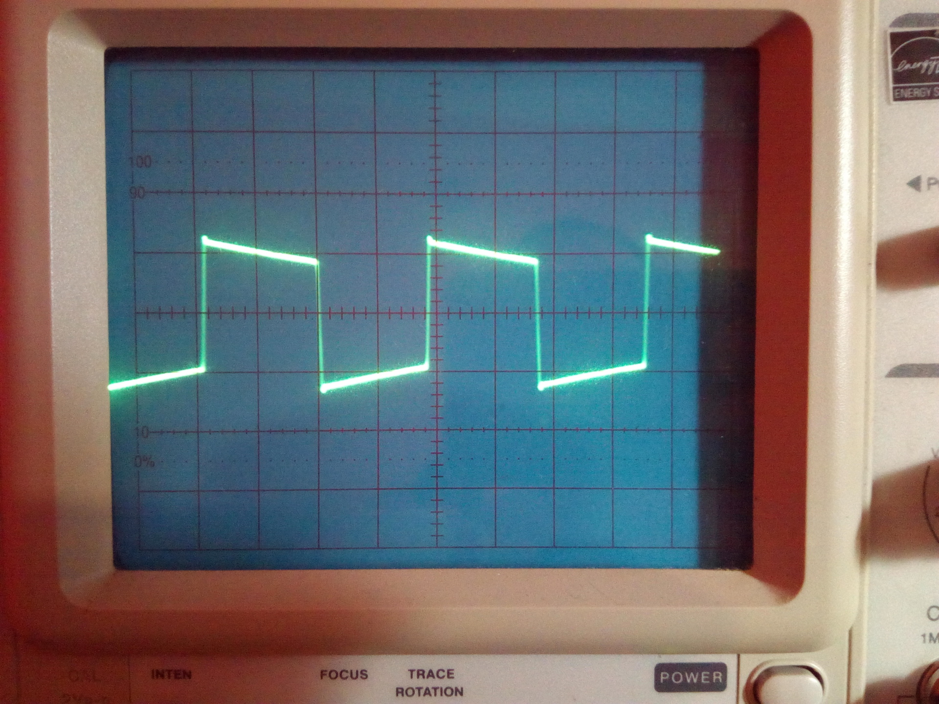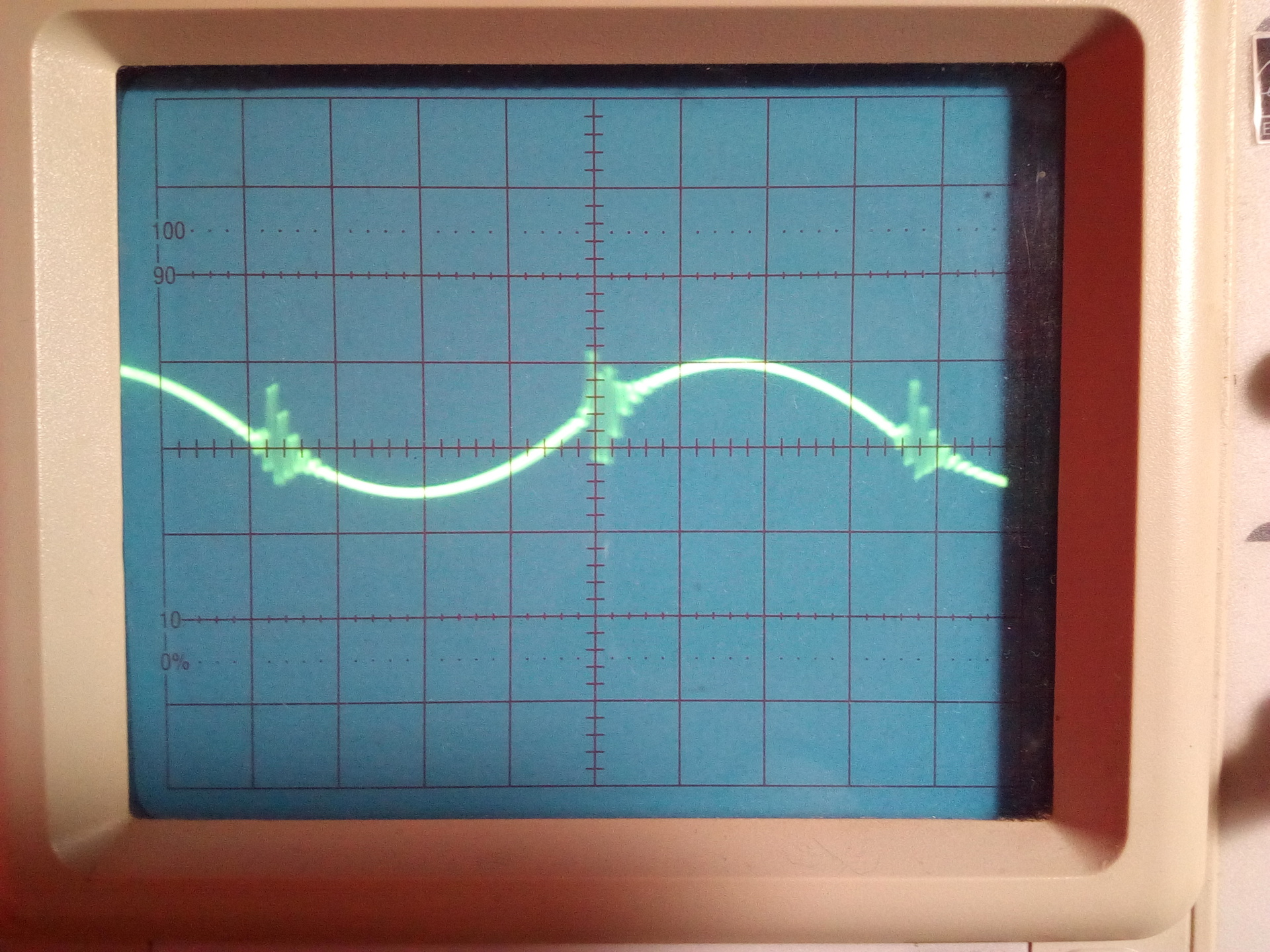 Megépítettem a Cikkben szereplő D osztályú erősítőt. Egyenlőre öszedrótozva élesztgetem az asztalon. Lenne pár kérdésem,mert teljesen új a számomra ez a D osztály. +- 56 voltról táplálkozik,a +15 voltot külön tápról kapja. A kimeneti szűrőt bontott pc táp magjára tekertem. 14 menet + 0,8mm légrés adta ki nagyjából a 30uH-et. Nos ez így nem klappol. Ha nincs jel,leáll az oszcilláció. Meg nem tiszta a hangja,grízes. Ha kiveszem a légrést,akkor már van oszcilláció,nagyjából 130-140kHz körüli a kapcsoló freki. Kimeneti szűrő után ilyen képet kaptam (fotó). Merre meg mit mérjek,korigáljak hogy jó legyen.? Miért állhat le az oszcilláció? Előre is köszönöm.