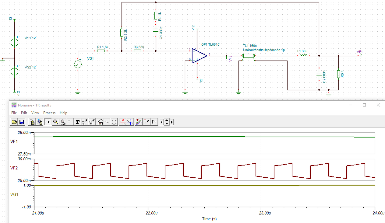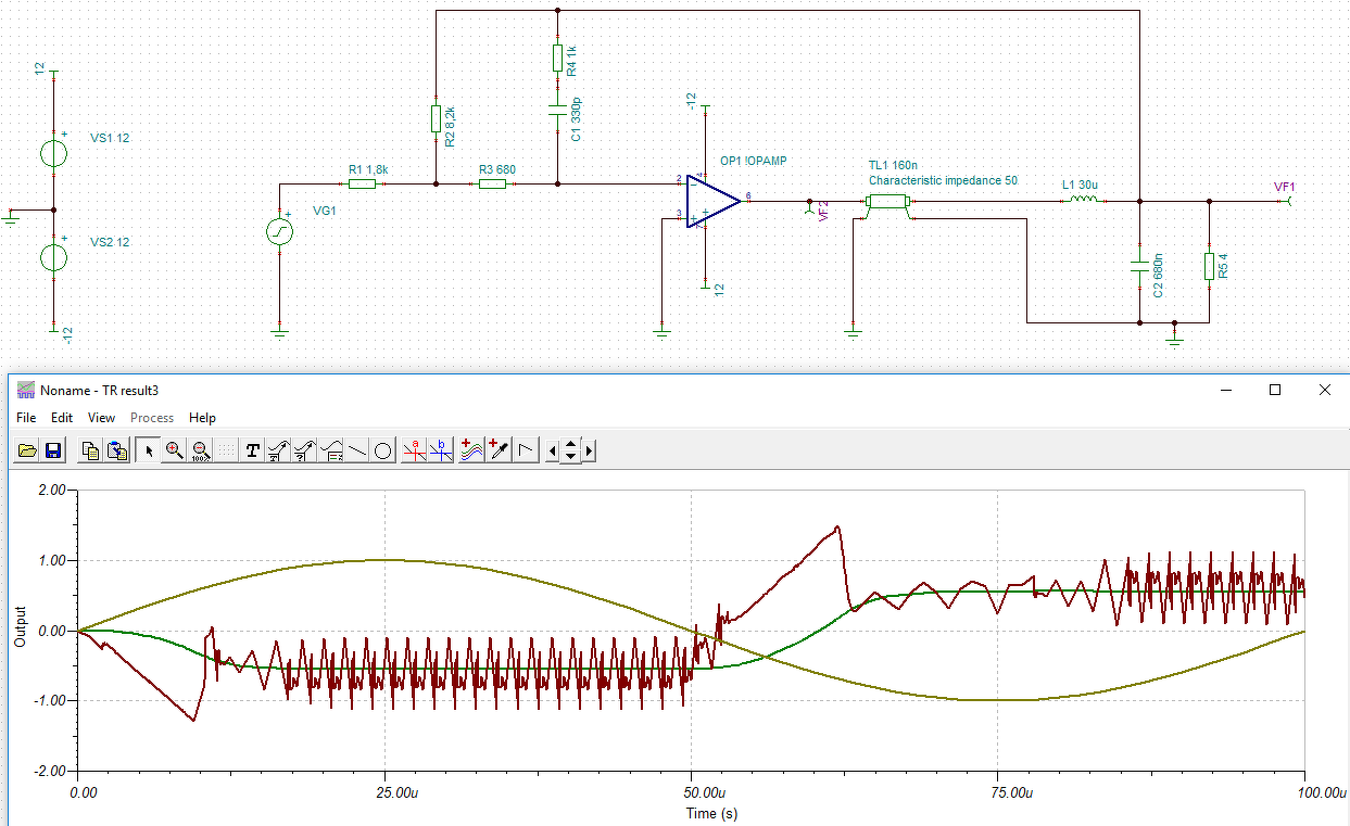 Bruno egyik leírásában szerepeltetett kapcsolást szeretném reprodukálni és szimulátorban lehetőleg minél inkább megérteni. A problémám a késleltetés hozzáadásával jön be. TINA-ban van egy Lossless transmission line komponens, aminek az impedanciáját és a késleltetését lehet beállítani. Gondoltam ennél tökéletesebb nem is kell, az impedanciát a lehető legkisebbre állítom, hogy a kimeneti szűrőm adott frekvenciánál való fesz.osztását ne zavarja és kb. tényleg egy vezetékként legyen jelen, csak éppen késleltetővel.