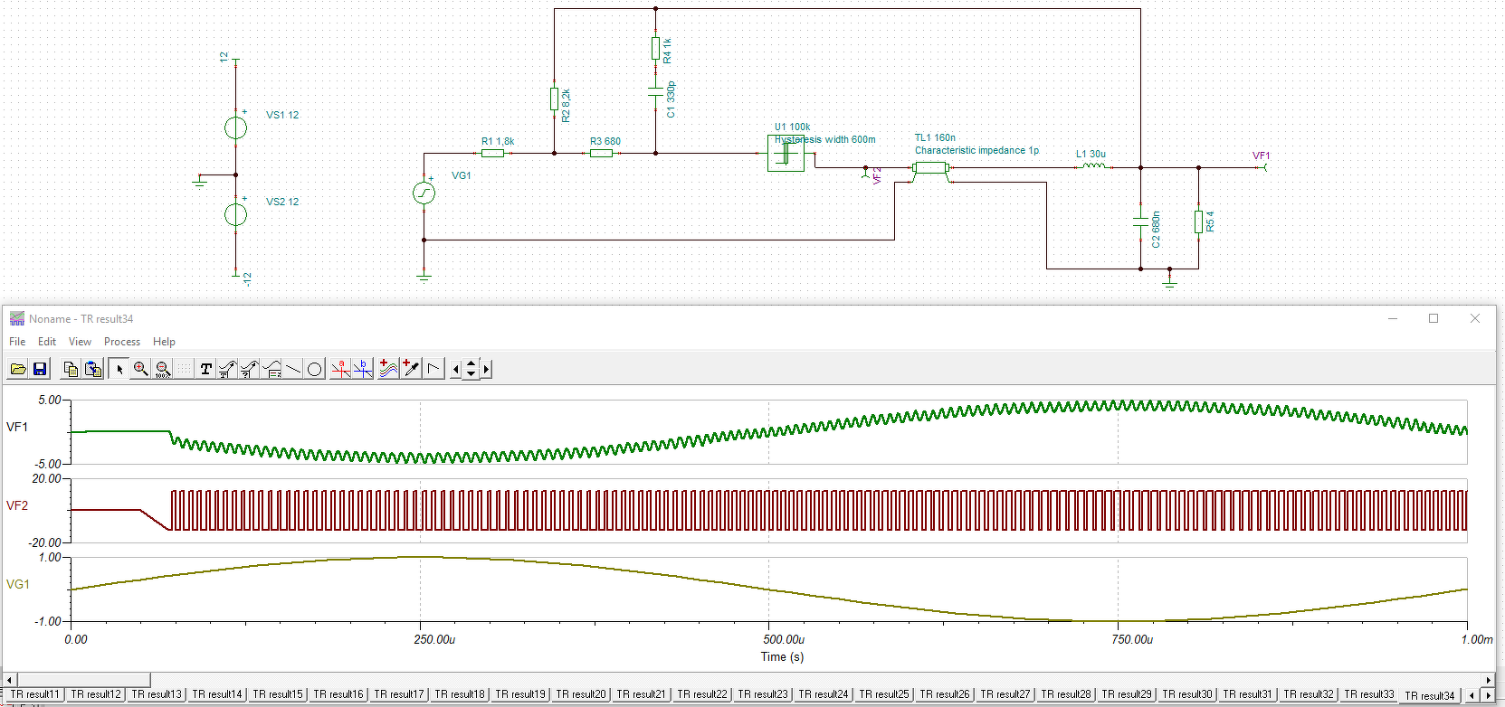 Egyébként nem adtam fel, mondom megnézem nem valós elemekkel, mondjuk a műv. erősítőt kicserélem egy komparátor komponensre. Láss csodát megy (harmadik kép), viszont csak hiszterézissel megtoldva tudja követni a lassabb (pl. 1kHz-es) szinusz jelet. Hiszterézis nélkül néztem, akkor 10kHz 1Vpp szinusz-t tudott követni.