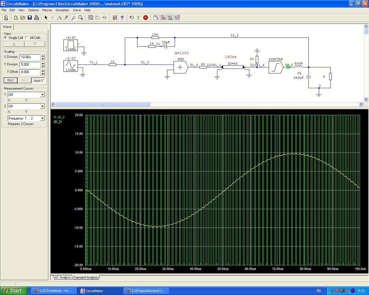 Az második képen látható az eredmény. Egyébként kiszámolva az átviteli függvényt sem éppen olyan alakot kapok amit várnék. (A forrás 10kHz 1Vpp szinusz)