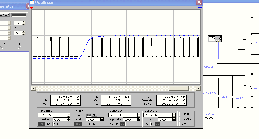 Tudom, ha beteszek egy 300Khz-es négyszöggenerátort, és rákötöm egy 1pF-os kondival a bemenetre, akkor már helyrejön az időlépték és eltünika a fáziszaj, meg a tüskék. Elég gyagya egy szimulátor, de egyszerű. (A multisimet már rég leírtottam a gépemről helyhiány miatt.)
