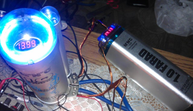 Szereztem egy 1 farádos kondenzátort. Feltöltöttem és betettem egy jó dobos nótát. Szkópon pont elkaptam mikor jött a dob a 2 ohmos hangszórón 50Vpp mértem. Meg szereztem 1.6mm átmérőjű huzalellenállást. Ne kérdezzétek a méterenkénti ellenállását mert még nem jutottam odáig hogy megmérjem.