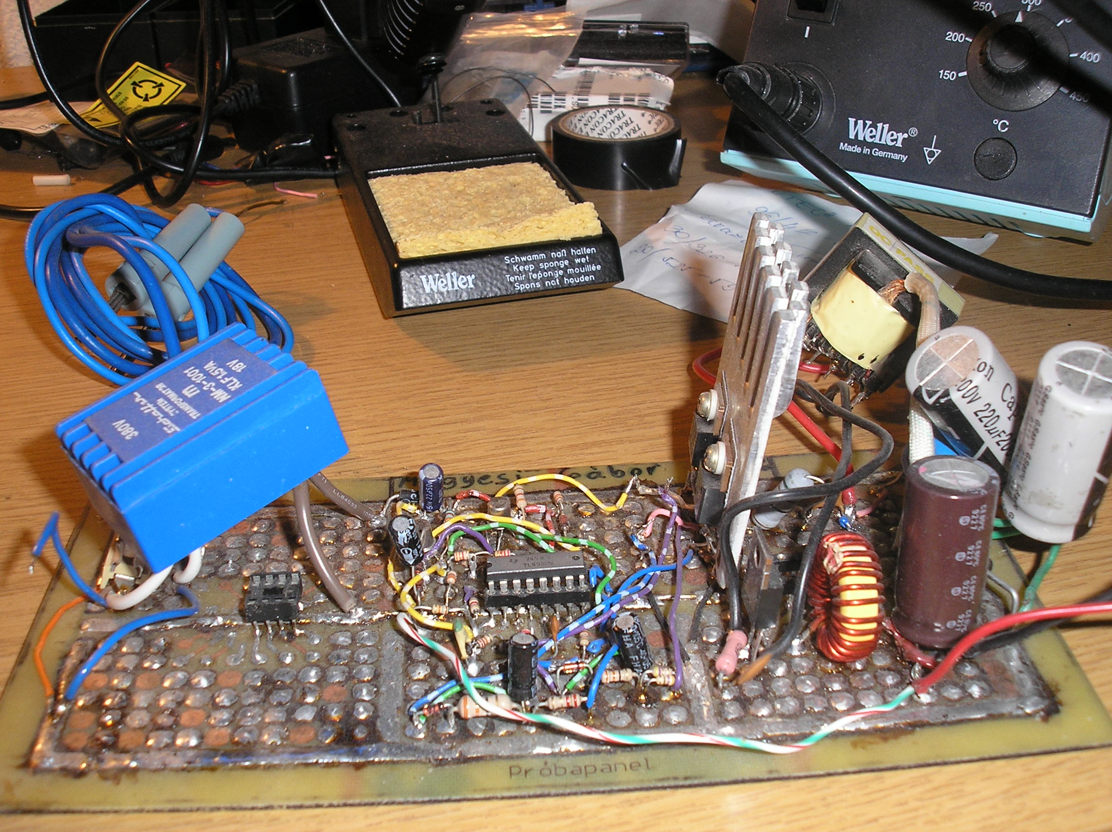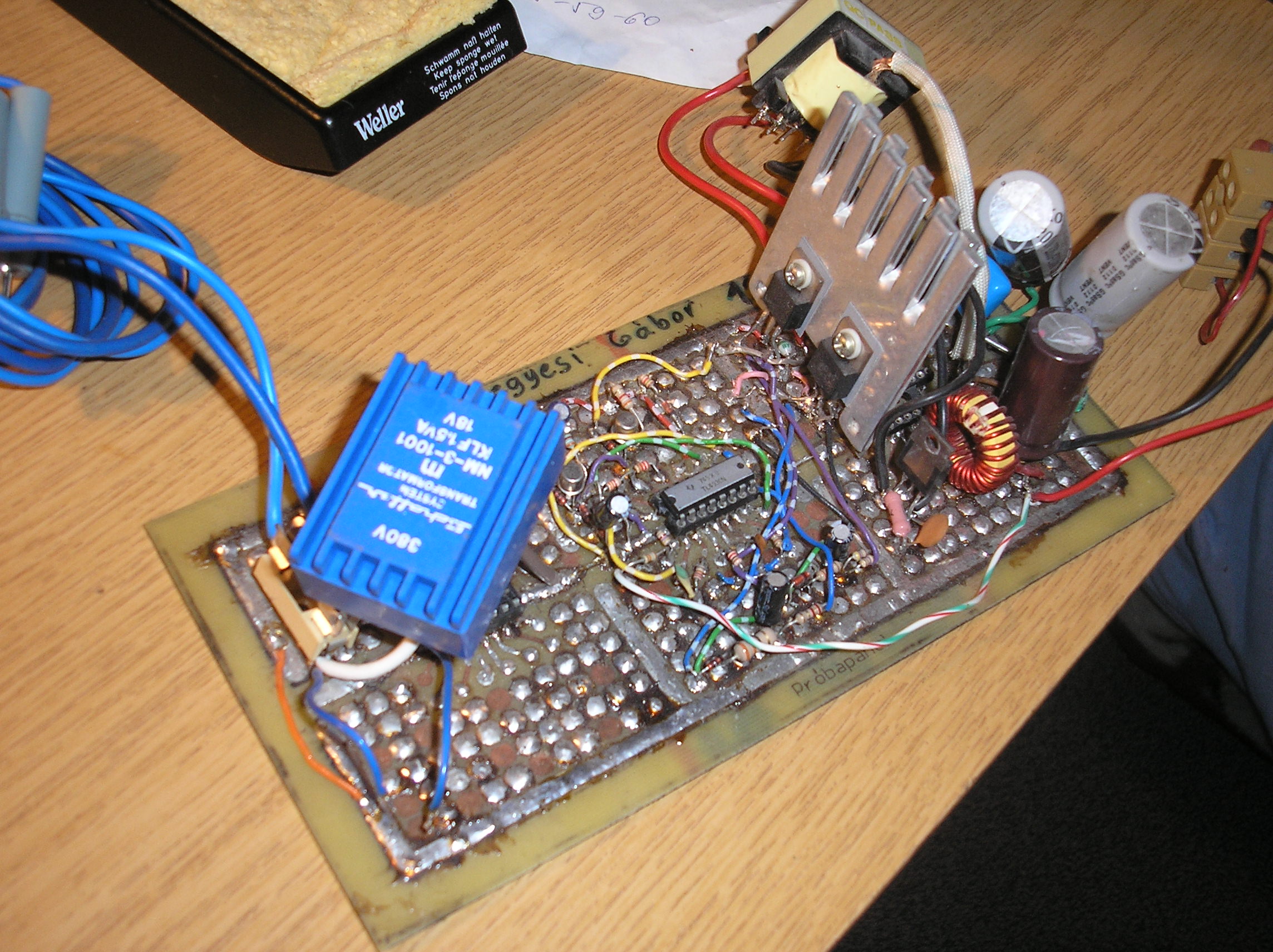 , csatolok néhány fényképet róla.Már nem működőképes, mivel hiányzik belőle a teljesítménytranzisztorokat meghajtó apró EE10-es kistrafó, és a hálózati Graetz-híd (hálózati zavarszűrő, szimmetrikus fojtó nem is volt benne soha, mivel ahogy megfigyeltem a gyártók is szeretik kispórolni termékeikből). Kapcsrajz is van róla, de a próbapaneles mérések közben módosítottam rajta. Ha lesz időm, akkor újra átrajzolom, és felrakom. Az áramkörről: -hálózati bemeneti rész: itt egy F3,15A-es bizti és egy 22ohmos NTC van. Zavarszűrőt nem raktam bele, de van egy aranyszabály: a biztosíték minenek előtt :yes: . Ahogy bejön a 230, rögtön a biztosítékot kell elsőként, bekötni, utána jöhet a többi. -a kék színű 380V/18V-os 1,5VA-es kistrafó a szekunder oldali vezérlőáramkört és a tl493-et látja el tápfesszel. ATX-es, pc tápokban egy kisteljesítményű flyback kapcstáp van, ami főleg olcsóbb fajtáknál önrezgős is lehet. Csak azért 380V-os primerű, mert csak ilyen volt kéznél. -A vezérlőáramkör egy tl493-as (asszem csak abban különbözik a 494-től, hogy az 2. hibajel erősítő bemeneten van 100-200mV offszet eltolás, az áramhatárolás végett, de ez ebben az alkalmazásban nem használt) -A 493-as kimenetei egy egy 2n2222-őt hajtanak meg, amik meghajtják a tranyómeghajtó kistrafót. Először bc639-et használtam, de azzal nem volt olyan meredek a kapcsolgatás, és bizony a a telj. tranyók (2sc3039) melegedtek . De volt itt valamilyen probléma az elején: mivel a 2n2222-ők push pull formációban hajtják a trafót, és először a trafó közepét felkötöttem a közvetlen a +tápra. Ilyenkor picit gerjedt az egész. Szkóppal megnézve rájöttem, hogy a 493 nagyon érzékeny a tápján keresztül behallatszó zajokra :felkialtas: Végül is az lett, hogy a trafó közös pontját egy soros RL, 1n4148 és egy elkó szűrési formációval kötöttem be, és így már nem gerjedt. -A telj. kör: amint már írtam, ez egy félhidas formáció, a a hálózati graetz után van egy soros puffer 2*470u/250V, aminek a közös pontján egy 1u-os tömbkondin sorba van a trafó egyik vége, a trafóval párhuzamosan van egy soros RC tag (2,2n 1kV/47R 5W). A trafó másik vége megy a meghajtó trafóba, ahol 1menetes tekercs után megy a két tranyó közös pontjára. A meghajtó trafó 1menetes tekercsén való átvezetés a meghajtó tr. lemágnesezését segíti elő. -Egyenirányító+szűrő: a trafó szekunderének közepe a GND, a két vége megy egy-egy schottky diódára. a diódákkal párh kell kötni egy-egy soros rc tagot (10n/15r 0,66W), mert mivel alacsony a max. záróirányú feszültségük, könnyen elszállhatnak tranziens jellegű feszlökésektől. a diódák katódja közös, és egy ~50uH-is toroid induktivitásra megy, utána egy egy 1000u-os elkó. Fontos :felkialtas: az elkok a kimeneti energiatárolórészben low esr típusuak legyenek. Jó az is, hogy ha 105c-os hőmérséklettűrésűeket használsz. Ne használj semmiképpen 4700u-nál nagyobb elkot, mert ennek már nagyon nagy az ESR értéke. Inkább több kicsit párhuzamosan, azzal sokkal kisebb a kimeneti zaj -zavarszűrő lc tag: ilyent most nem raktam bele de jó ha van . Néhány uH-is nagyjóságú induktivitás (vagy ami még jobb: 2-3cm-es ferritcső. Ilyent régi Videoton tévékből bontottam: baromi jól szűri a nagyfrekis zajt ajánlom figyelmedbe). És egy 100-470u-os low ESR elkó. Ennél nagyobbat nem érdemes belerakni, mert a nagyfrekis szűrés miatt nagyon kicsi esr kell.Néhány adat: A kimeneti fesz +13,8V, TDA IC-s autós erősítőket probáltam vele, és nagyon jól szóltak. Szinte ugyanúgy mint a rendes tápoknál (viszont itt nem volt egy gagyi hálózati brumm sem :yes: ) . A terhelhetőségéről annyit, hogy 1 ohmos ellenállást hajtotta 30mp-ig. Tovább nem mertem rajthagyni, mert a hűtőborda ami a tranyókon van, sajnos kevés volt. Mivel a túlterhelés. túláramvédelem nincs rajta, vigyázni kell vele. Egyszer műterhelésként egy 50W-os halogénizzót használtam, aztán a valamelyik bekapcskor a tranyók megadták magukat. Végül is érthető mert hidegen kb. 0,1 ohm az ellenállása. Ennek kompenzálása érdekében LÁGYINDÍTÁSt kell alkalmazni a vezérlőáramkörben, az adatlapokon van rá példa (soft-start). Ennek hiányában akár a halogénizzóhoz hasonlóan az elkók is megdögleszthetik a tranyókat (vagy a táp vágja haza az erősítőt )A félhidas tápot sajna nem fejlesztettem tovább, mert: - a megfelelő túlterhelésvédelem megvalósítása nehézkes -a tranyók nagyon melegednek --> kicsi hatásfok: ~50W-nál is csak 70% . Helyette célszerű inkább MOSFET-ekkel próbálkozni- a TOPSWITCH-ekkkel sokkal jobban lehet a célt megvalósítani powerint.com, ha érdekel.