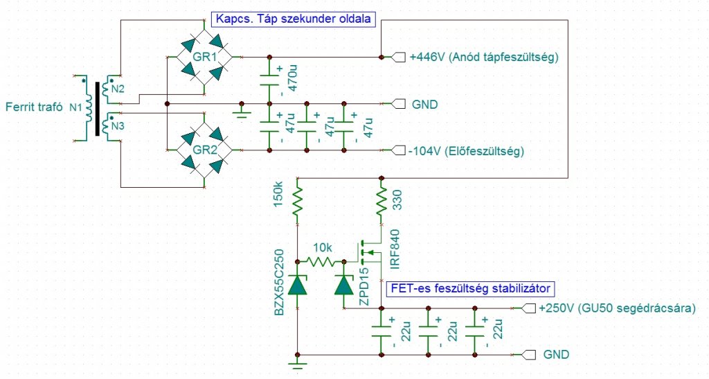 A -104V-ot előállíti diódahíd rosszul van! (így +104V lenne ott). Másik dolog, hgoy nagyfrekvenciát szűrsz, így akár kisebb kondik is elegek. Számold bele, hogy a rezonáns tápod fesze esni fog terhelésre. Szerencsédre a cső alapjáraton sokat fog zabálni, de azért érdemes nagyobb fesztűrésű kondikkal dolgozni. Emiatt pl a 446V-ra nem elég a 450V-os kondi. (így jobban is jársz feszkétszerezéssel és 250V-os kondikkal)