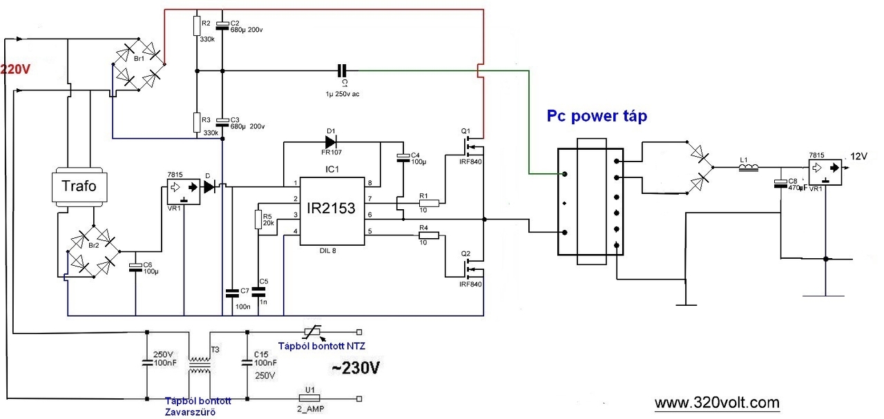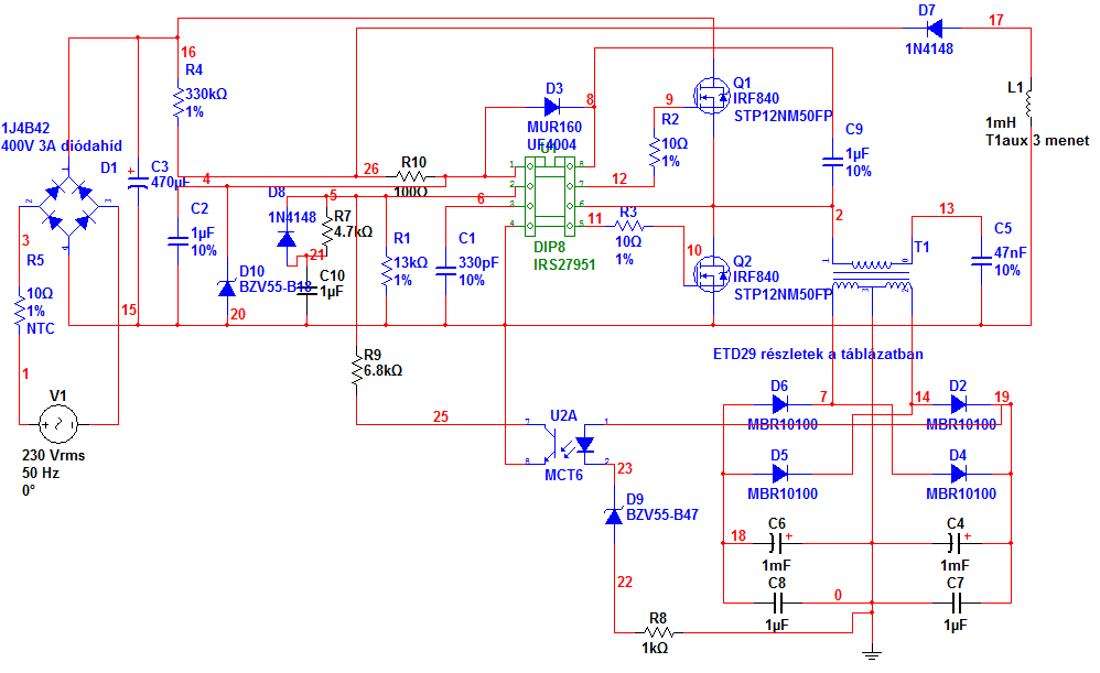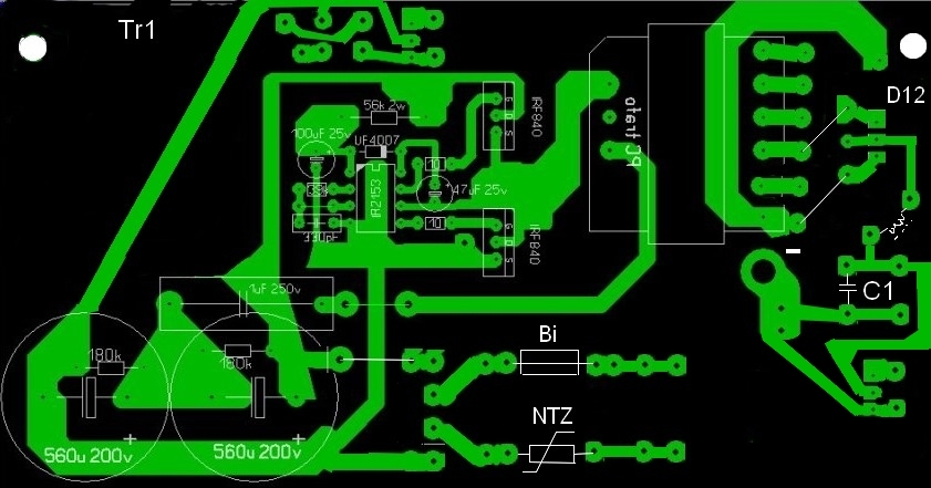 Ezek után a disszipáció (ohm-törvény): P=U*I=(325-15)*(5+2)=2,17W Az IR215x-ben van beépített zéner (15V-os), ha még beraksz egy zénert, és arra is áramot küldesz (úgy állítod be az ejtőellenállást), akkor csak több elsz a disszipációd. (a zéneres stabilizálónál mindig úgy tervezünk, hogy nulla terhelés esetén minden áram a zénerre menjen, amikor pedig max terhelés van,a kkor is menjen kis áram a zénerre, hogy a feszültésg fixen maradjon). Én a következőt szoktam: berakok két darab 100kOhm 0,5W ellenállást sorba, amely az indulsánál szolgáltatja az áramot. Berakok egy segédtekercset is, ami pedigindulás után rásegít. Lásd a stabilizált rezonáns tápodnál. Mind a kapcsolás, mind a panelrajz nagyon rossz. Kezdjük a kapcsolással: Szóval akkor te stabilizált 12V-ot szeretnél (stabkocka a végén)? Ennek így sok értelme nincsen, ha stabtáb kell, akkor kis teljesítméynre flyback, nagyobbra pedig mondjuk a stabilizált rezonáns, vagy ha jobb stabilitás kell, akkor félhidas táp (PC tápot alakíts át). Szóval először tisztázd mit szeretnél: Hány Volt hány Amper? Mit táplálna? Kell hogy stabil legyen? Először az alapkoncepciót kell tisztázni, csak utána tudunk segíteni. A nyákterv rossz: a fontos áramvezető részek (+ és - táp a konditól) nagy hurkokon megy át, nem is beszélve maga a trafó primer áramáról. Itt gondolj bele, hogy nagyfrekvenciás áram folyik, a hurok pedig úgy viselkedik, mint egy menet a transzformátoron, csak itt nem amgba, hanem a levegőbe csatol, és akkor látod, hogy ott egy antenna.