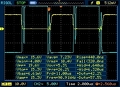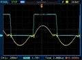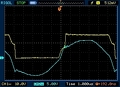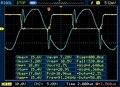 A Cimó tápba vissza tettem a trafót, az N67 magokkal, 91KHz-en ilyen a jelalak. Sárga Ugs, kék primer áram. (NewFile5) Ezt mutattam tegnap is. Tüske az áramban, mert túl nagy a holt idő. Vagyis túl gyorsan töltődik át a meddő áram. Aztán egy másik kép mutatja az Ugs (sárga) és az Uds (kék) jelek arányát. (NewFile6) A nagy holtidőtől ott az Uds-ben a lengés. Ez is ilyen volt tegnap.