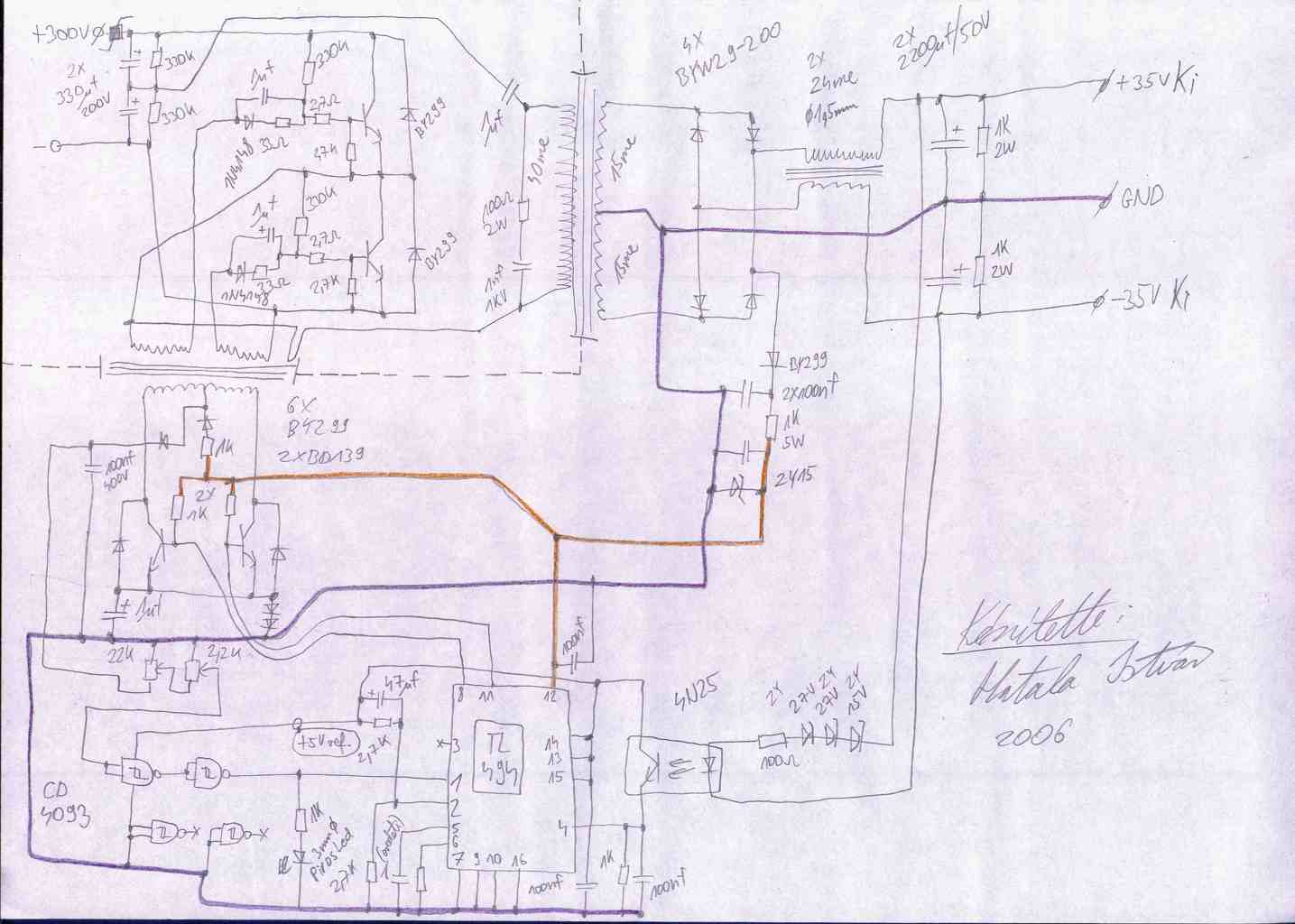 A meghajtójeleknek egyformának kellene lenni, gondolom a PC táp eredeti meghajtótrafójával csináltad meg. Azt mondjuk nem nagyon értem hogy az eredeti bevált megoldás miért nem volt jó egy az egyben, és a feszültségszabályozáshoz miért a DT láb van felhúzogatva, miért nem a hibaerősítő végzi? Sőt minek egy végfok táplálásához a feszültségszabályozás? A 4093-at sem nagyon értem miért van ott, talán valami alacsonyfesz védelem.