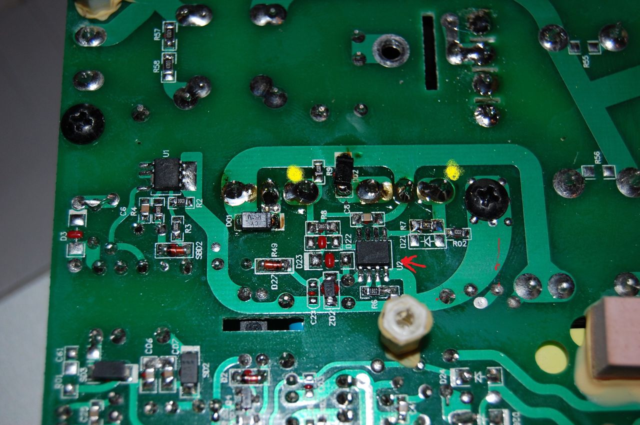 Szia kicseréltem a feteket a tápban és diódák nélkül indítottam nem robbant fel semmi viszont nem megy még a táp halk sípoló hangot ad de nincs a trafón semmilyen váltó fesz, az egyen irányítás megvan de a sárgával jelölt pontokon a fetek G-jén nem láttam szkóppal semmiféle jelet viszont az icéről le van csiszolva a betű, esetleg van ötleted milyen ic lehet? Vagy ha külső tápot adnék neki lehetséges hogy jó az ic csak nem tudom melyik lábban kellene próbálkozni. A képen bejelöltem hol mértem