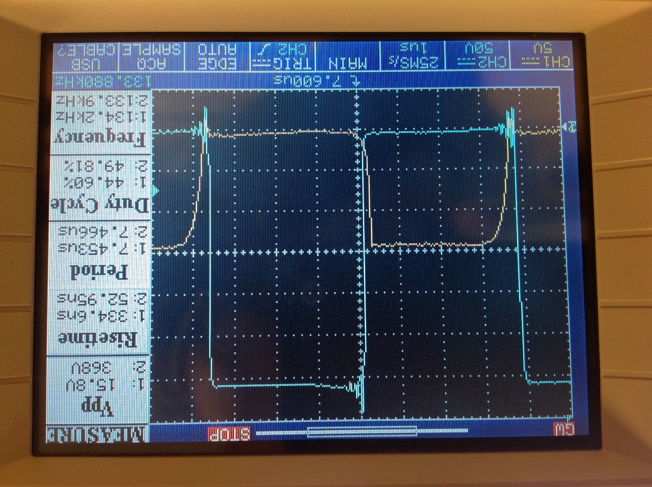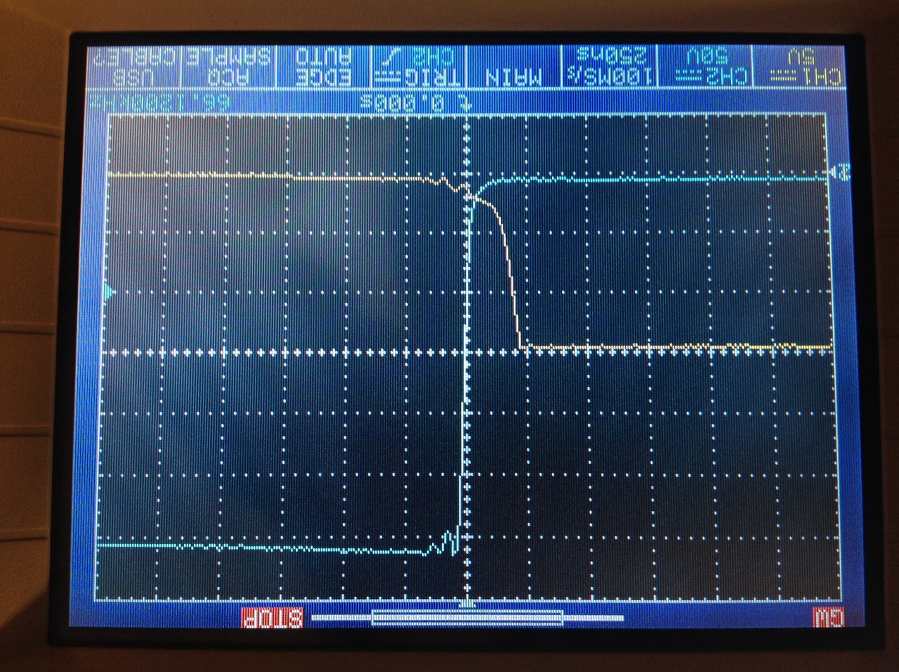 Na de most készítettem képet a 24 menetes primerrel, 400W terheléssel. Ch1 - FET UGS Ch2 - FET UDS Az alsó feten mérve. Valamint még a két utolsó képen a szinuszos áramot 1 ohm ellenálláson mértem a primerrel sorosan. Tehát 5V per osztás = 5A. Idézet: „De 12 primer menet esetén a FET melegszik, akkor gondolom ott van a veszteség.” Az oké, de rá kellene jönni, hogy miért, milyen egyéb hibát vétettél. Kicsit - nagyon idegesítő, hogy a szkóp fejjel lefelé van. Az azonban látszik, hogy a működés ZVS, hiszen a FET kikapcsolása után rögtön kezd felszáguldani a DS fesz, és a FET bekapcsolása előtt már leszáguld. A FET bekapcsolása előtti negatív tüske is látszik. A belengések a nagy parazita induktivitásokra utalnak. (vagy a később említett túl gyors félhídátmenet miatt) 5V per osztás, vagyis 36A pp van??? A primeren? Biztos? Biztos nem rontasz el valamit oltárira? Mert ha te félhidat használsz, és látszik 300Vpp a trafón, tehát 150V van a trafón, és a trafódon kb 10A eff folyik, az 1,5kW... Biztos nem az van, amit voodoo mond, és atomra elszámoltad magad? Mennyi most a mágnesező és szórt induktivitásod? Az is gyanúgy, hogy a félhídátmenet jó <50ns (ki kellene nagyítani), ez egyrészt túl gyors, vagy a hotlidő ehhez túl sok. Amúgy az áramgörbe alapján közel a rezonanciafrekvencián vagy. A hozzászólás módosítva: Jan 21, 2015