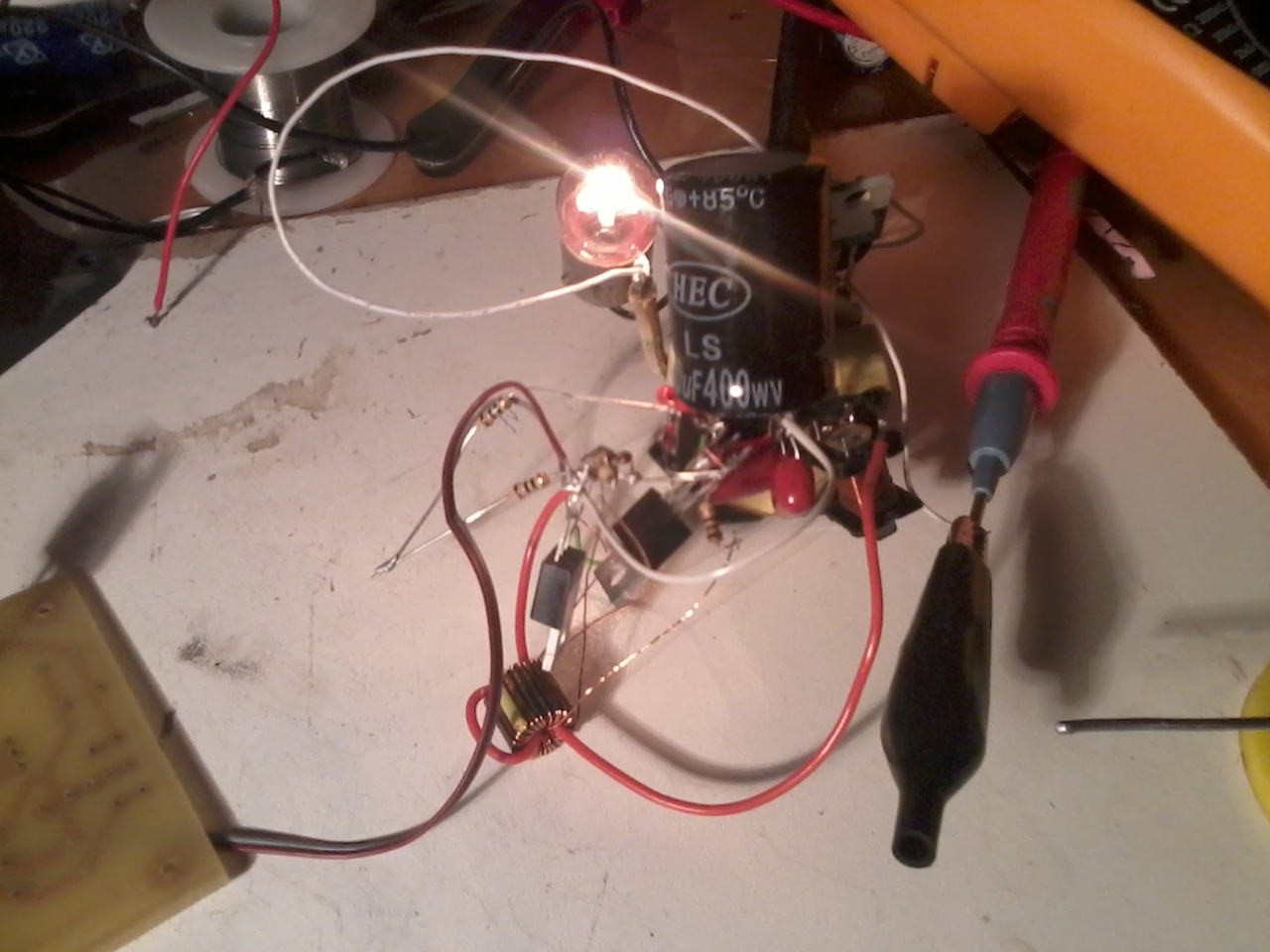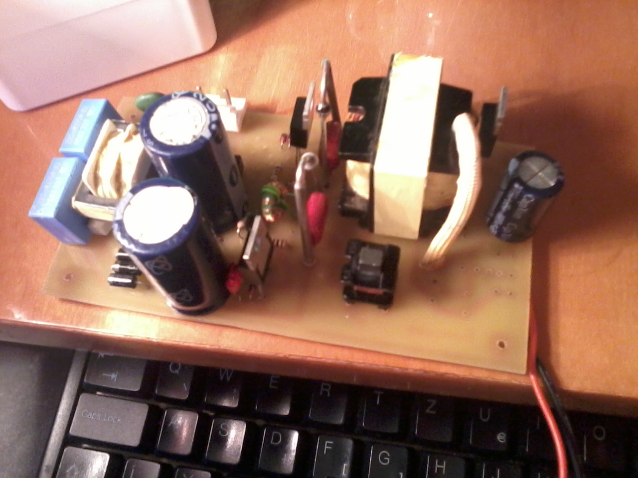 Idézet: „Ahogy elnézem, más a gyűrű.. talán az anyaga is?” Igen más a gyűrű, pontosabban gyűrűk, mert 2 gyűrű van összefogva. De a zöldel se ment a nyákon, meg ezzel se. Idézet: „Mérhetnél egy L-értéket is pl. az egyik 14.. menetnél és mi a különbség szintén.” Jelenleg a 2 gyűrűs változatnál a 15 menet adja az 500uH-t a zöld gyűrőnél ugyan ez kb. 9 menet volt. Idézet: „A soros induktivitásban elköszörült ferrit van vagy mi?” Nem ez egy fénycsőből származó teljesen gyári darab. Annyi, hogy letekertem belőle egy rakás menetet, hogy 55uH legyen az értéke. Van még egy, az még eredeti. Csatoltam egy képet rölla. A terhelhetőséget mi határozza meg? Nem próbáltam még terhelni jobban, de érdekelne hogy a toroid gyűrű szekunder meneteinek száma, vagy a soros induktivitás miképpen befolyásolja.