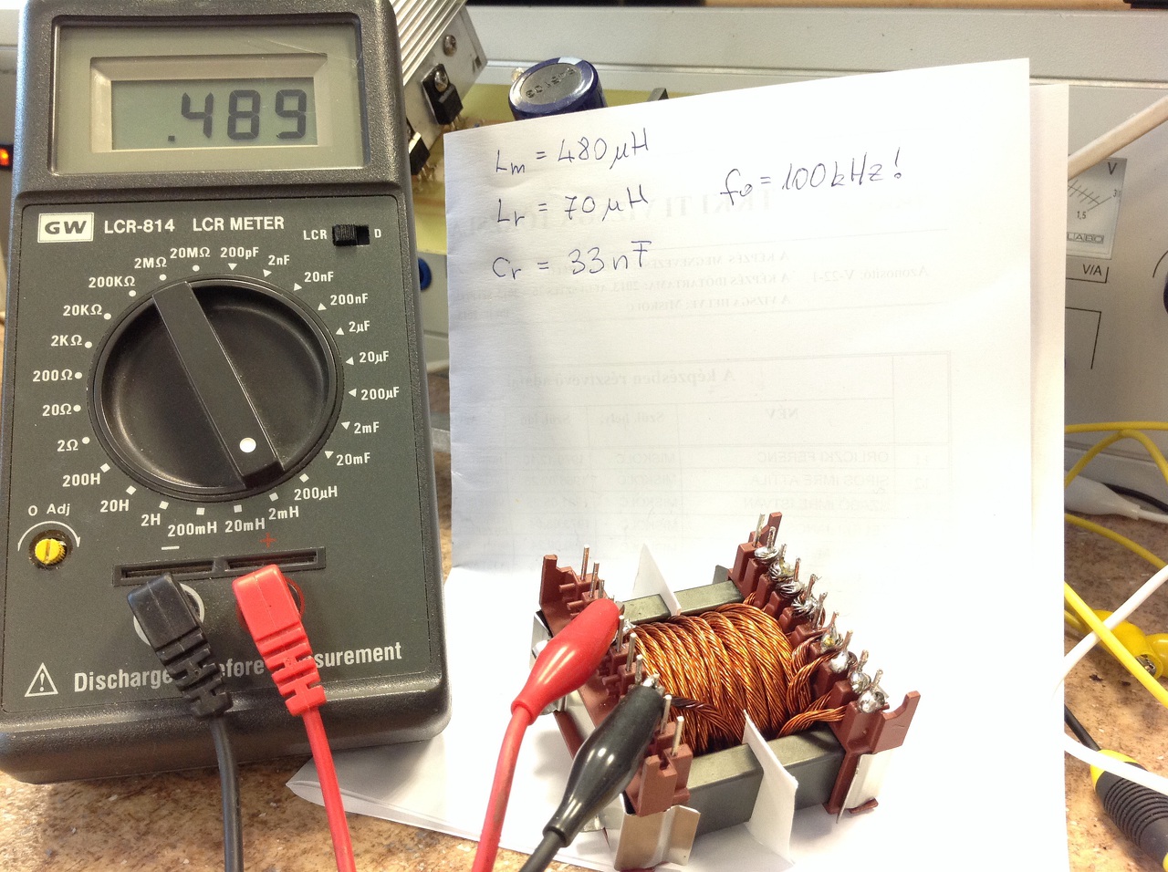 És itt van kibontva a trafó. Megmértem megint az induktivitást amit másik műszerrel mértem most, de hasonló értéket mutatott mint a múltkor. (papíron látható)