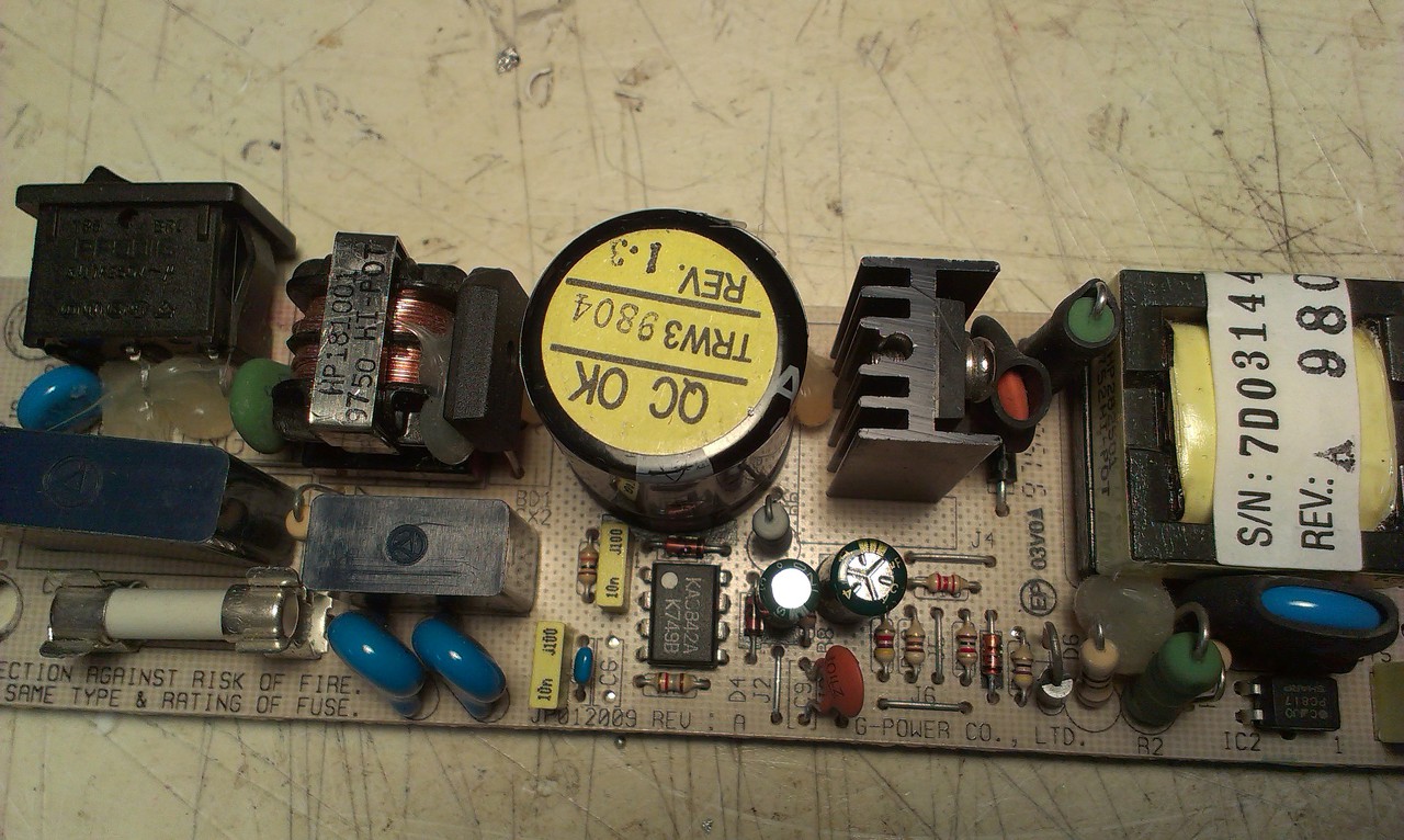 A gyári tápod nem véletlenül izzóhoz való, kapcsüzemű cucc? Mert az ide nem okés.