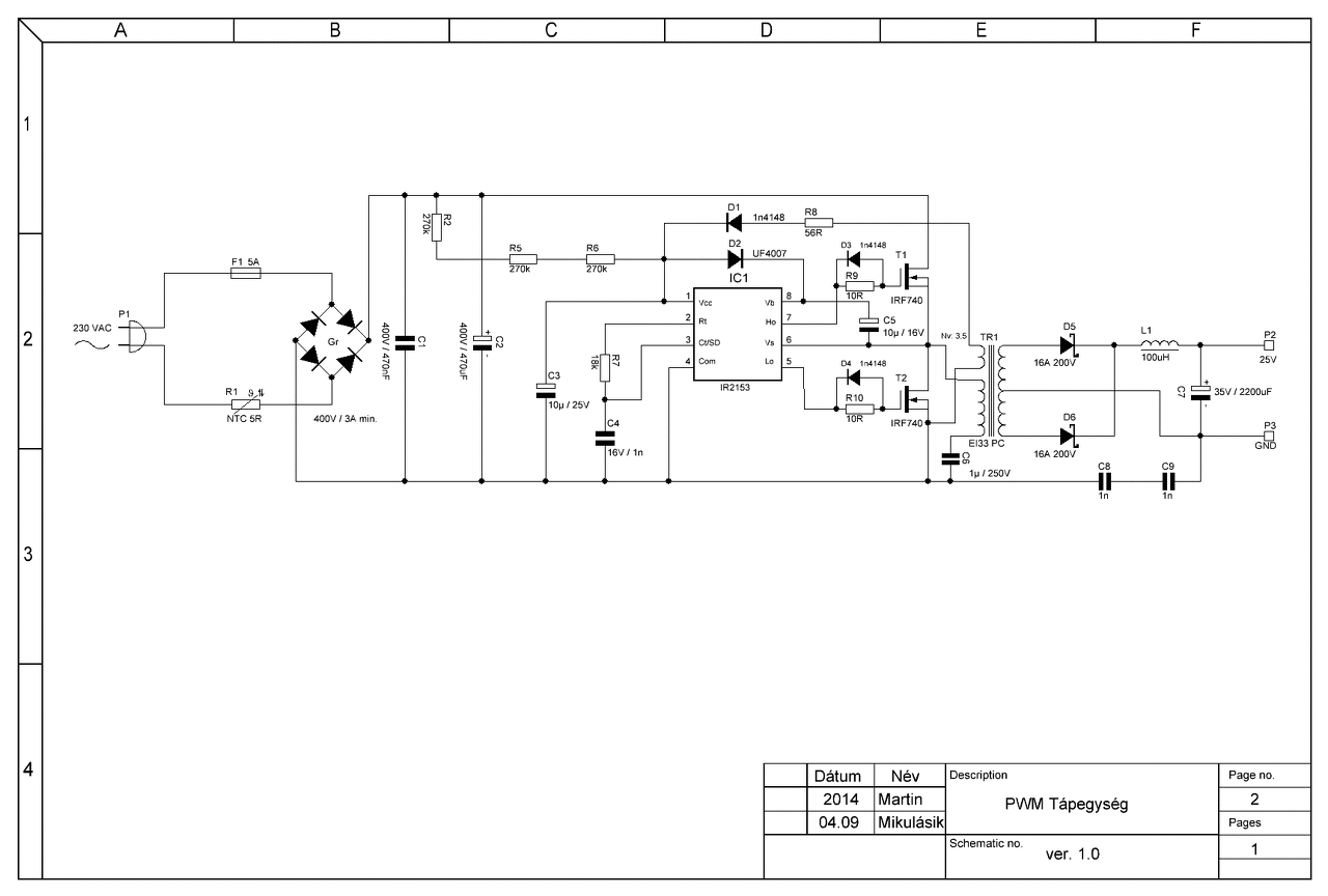 Ezt a tápot akarom megépíteni, de más topológiával PC tápból bontott EI33-as trafóval, amit eredeti állapotában használnék fel. Azonban az én elrendezésemben a primer oldala fordítva kapcsolódna a fetekre. Ez befolyásolja a működését, vagy önrezgő üzemben nem számít a tekercselési irány?