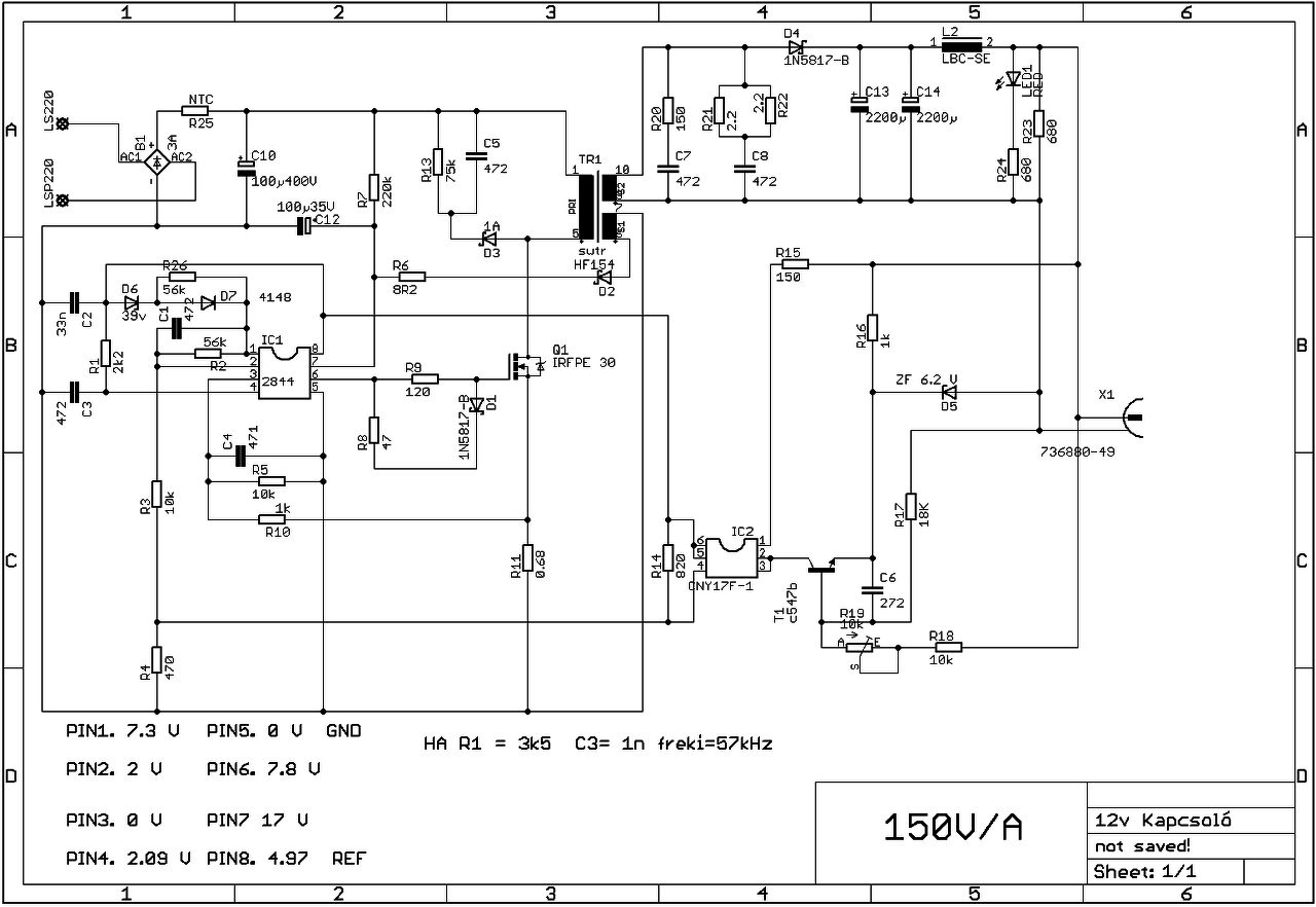 Szia. Szokásos. Soros izzóval élesztünk tápot, majd leírjuk, hogy milyen magunk van menetarányokl, drótvastagságok stb. De a legfontosabb, hogy betartjuk a minimális biztonsági követelményeket; ami primer-szekunder közt min 7 mm nyáktávolság részemről. Akkor a szekunder oldalon nem értem minek a graetzelés, ha úgyis csak szimpla kimenet van?