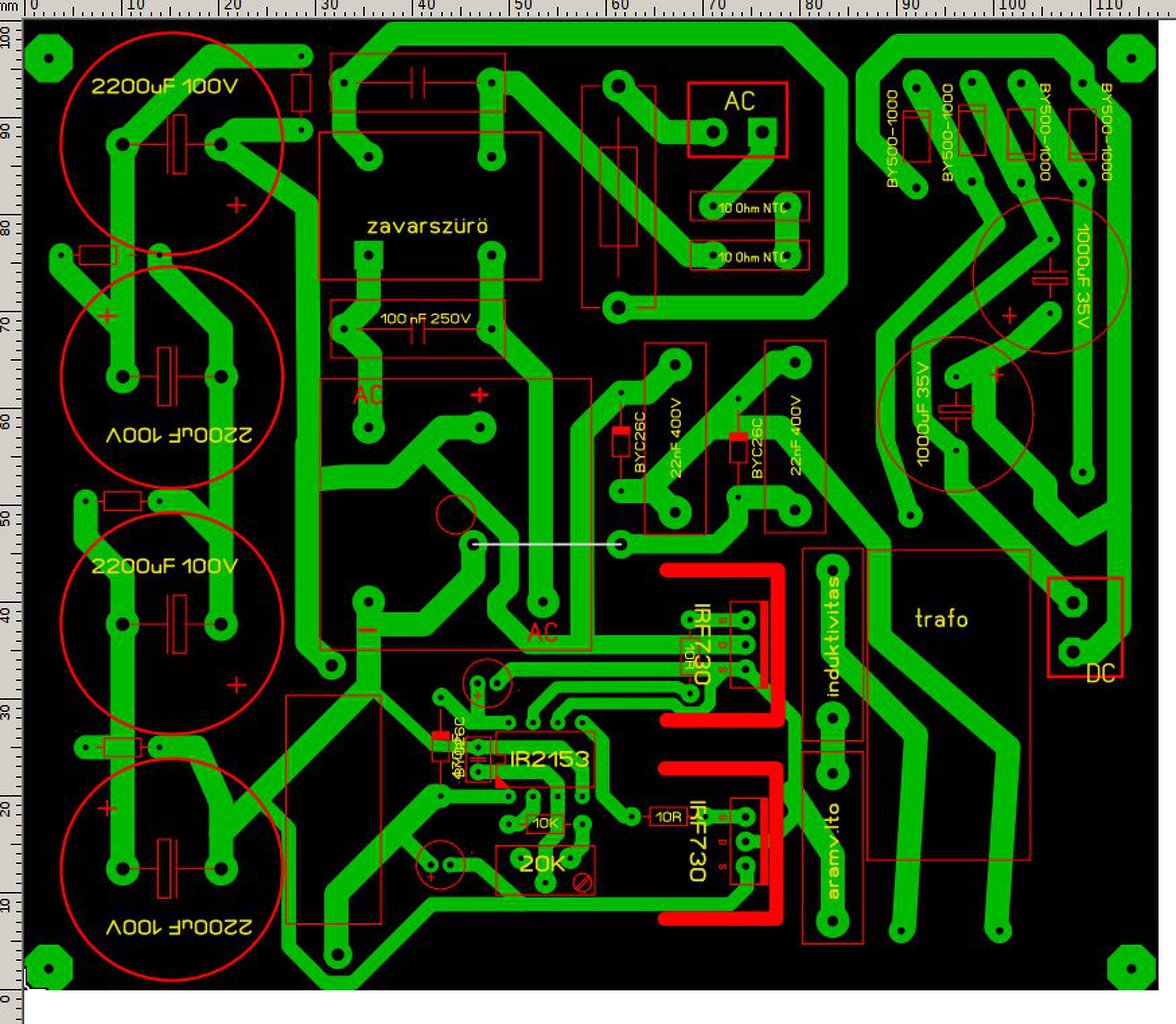 De komolyan milyen trafo van ott? Állított toroid? A nyákterv egy katasztrófa, csomó helyet elfoglal az a kb 800V 8 A graetz kocka ami még egy hegesztőbe is elmenne, hogy utánna ne tudj egy vagy két normális 400V/220µF kondit berakni (az is van 36mm magasban ha fontos a méret), hogy utánna össze vissza huzalozgatni kelljen.. szóval nem értem. A hozzászólás módosítva: Aug 30, 2015
