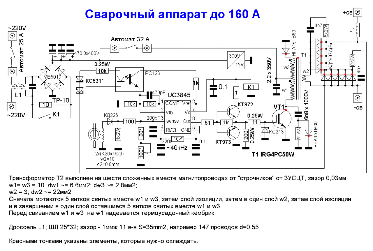 Itt van egy izmosabb megoldás az oroszoktól az egytranyós nyitóüzemű hegesztőre egy UC3845-el és egy IGBT-vel. A pár száz W-os ugyanilyen elrendezésű PC tápokban nem mindig használnak lemágnesező tekercset (a rajzon w3), hanem csak egy RCD snubbert szupresszorral kiegészítve, így egyszerűbb elkészíteni a trafót (van a fiókomban egy ilyen de nincs kedvem visszarajzolni).