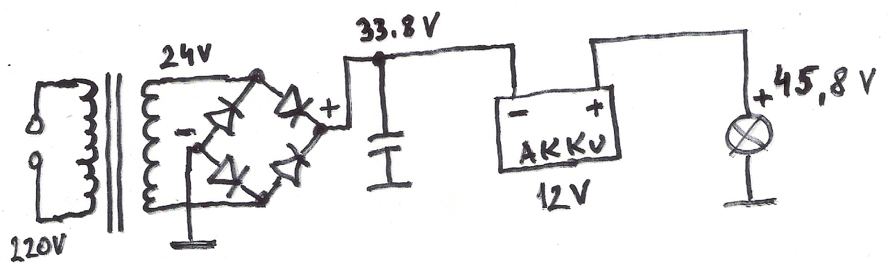 Én a rajzon egy izzólámpát, egy akkumulátort és egy egyenfeszültségű áramforrást látok, ami trafóról működik. A kérdés a rajzra vonatkozott és nekem ez így nagyon nem tetszik.